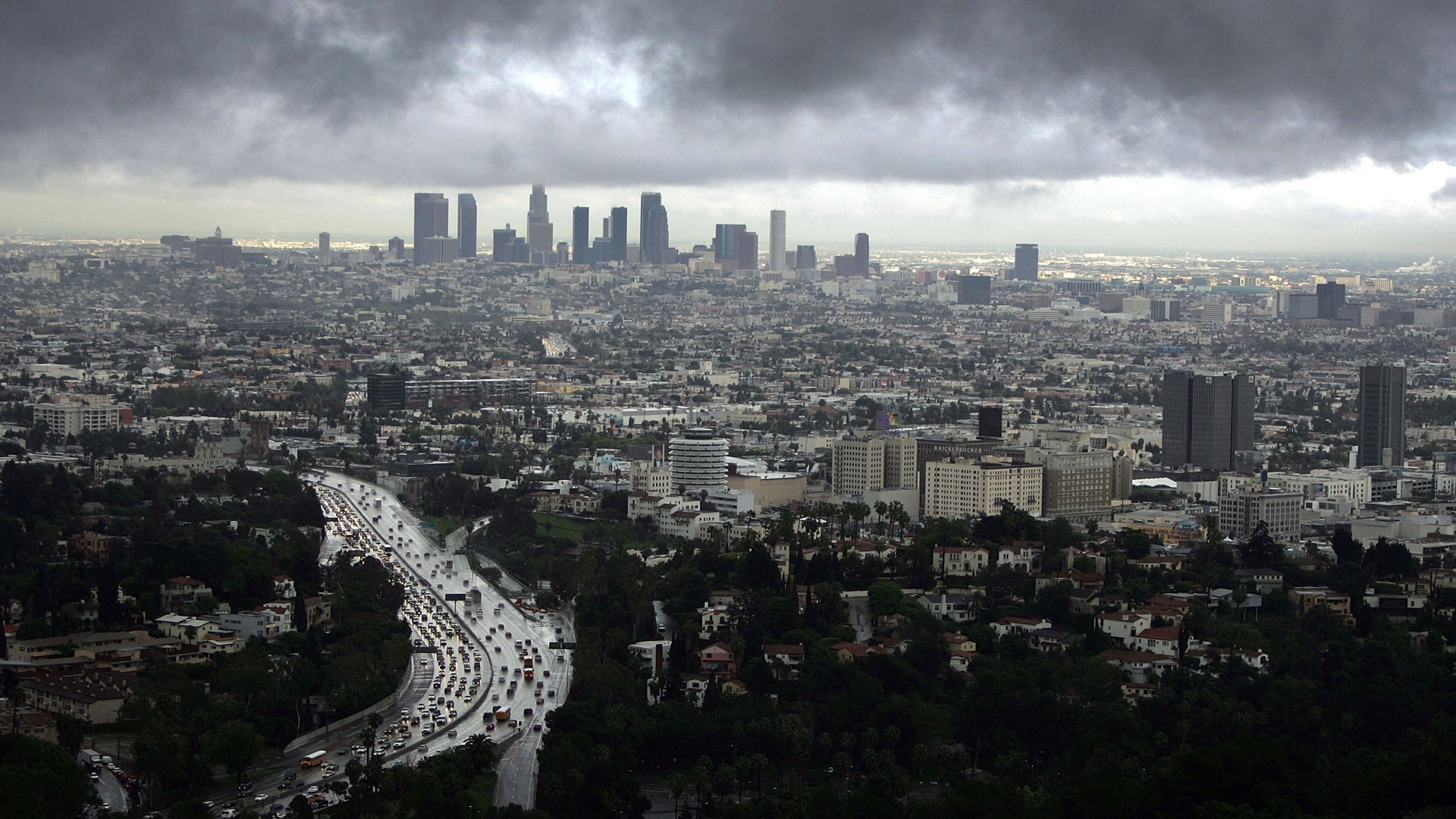 Description: A city with a lot of tall buildings and a freeway with cars on it and a cloudy sky above.