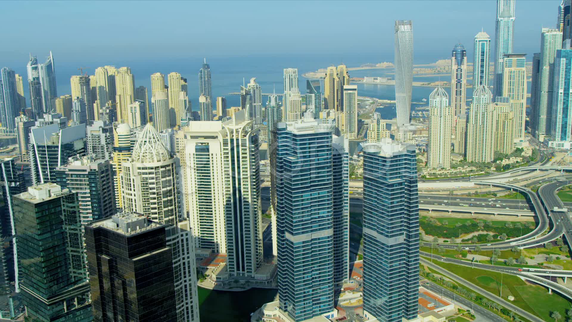 Description: A city with tall buildings and a highway in front of it and a body of water in the background.