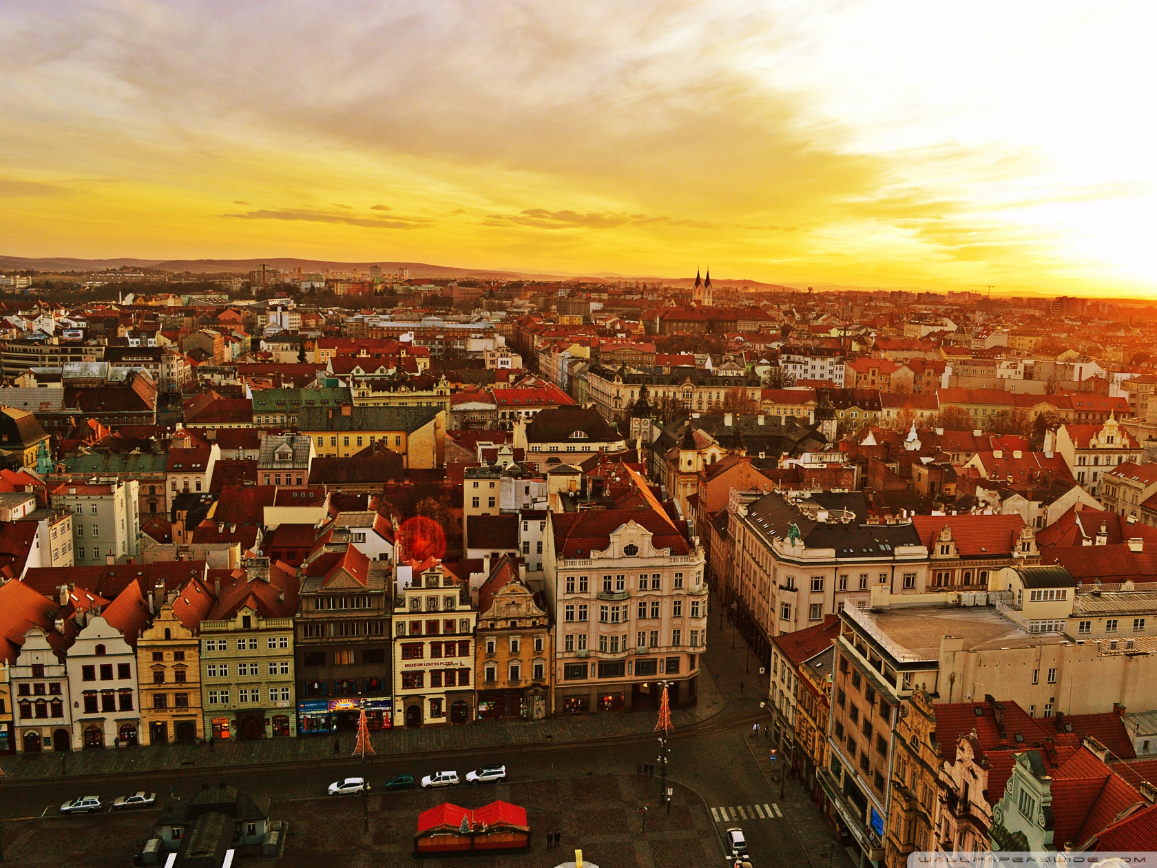 Description: A city with a lot of tall buildings and a sunset in the background with clouds in the sky above.