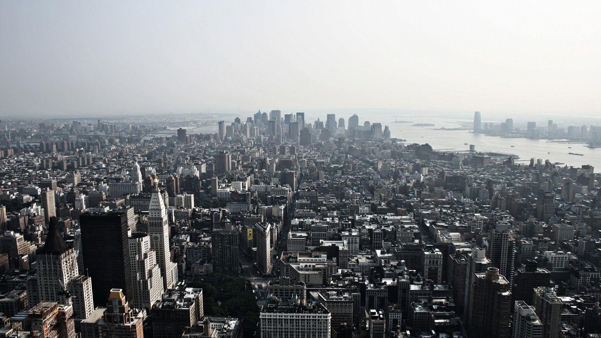 Description: A city with a lot of tall buildings and a body of water in the distance in the distance is a large body of water.