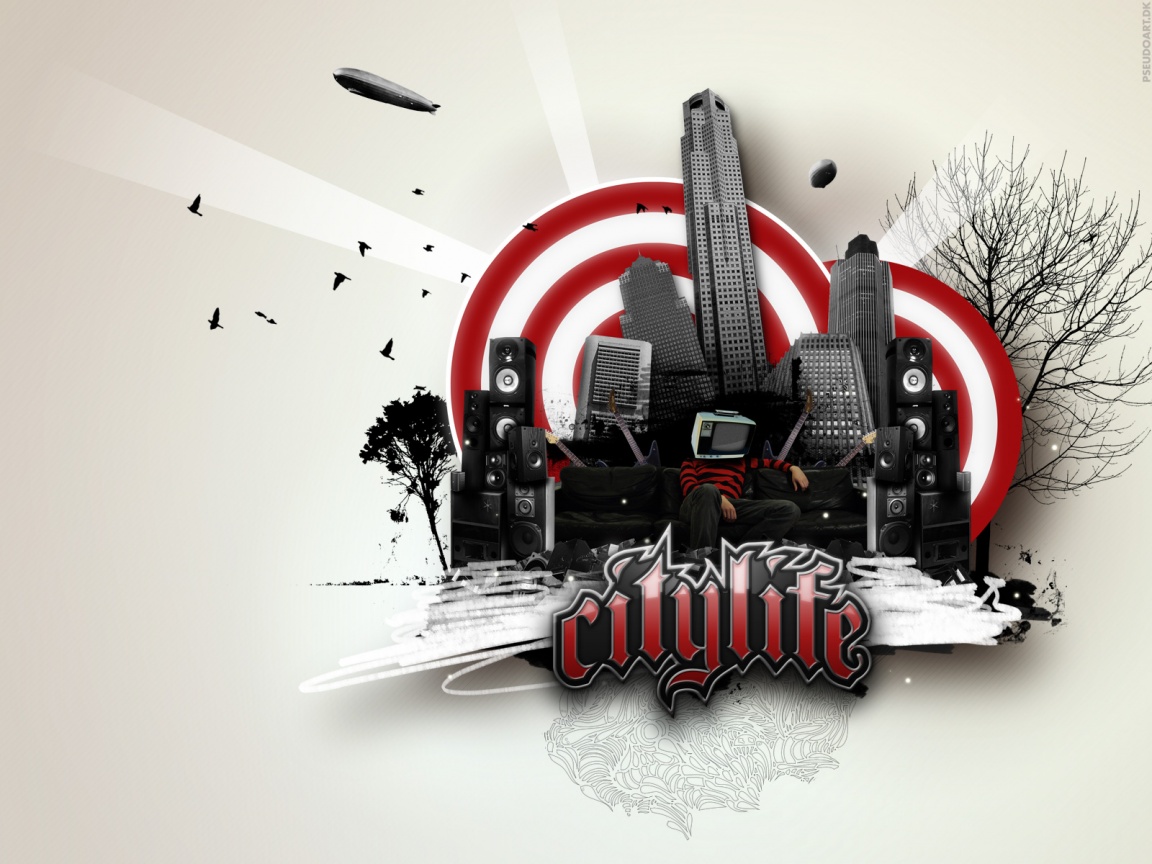 Description: A graphic of a city with a target in the middle of it and birds flying around it.