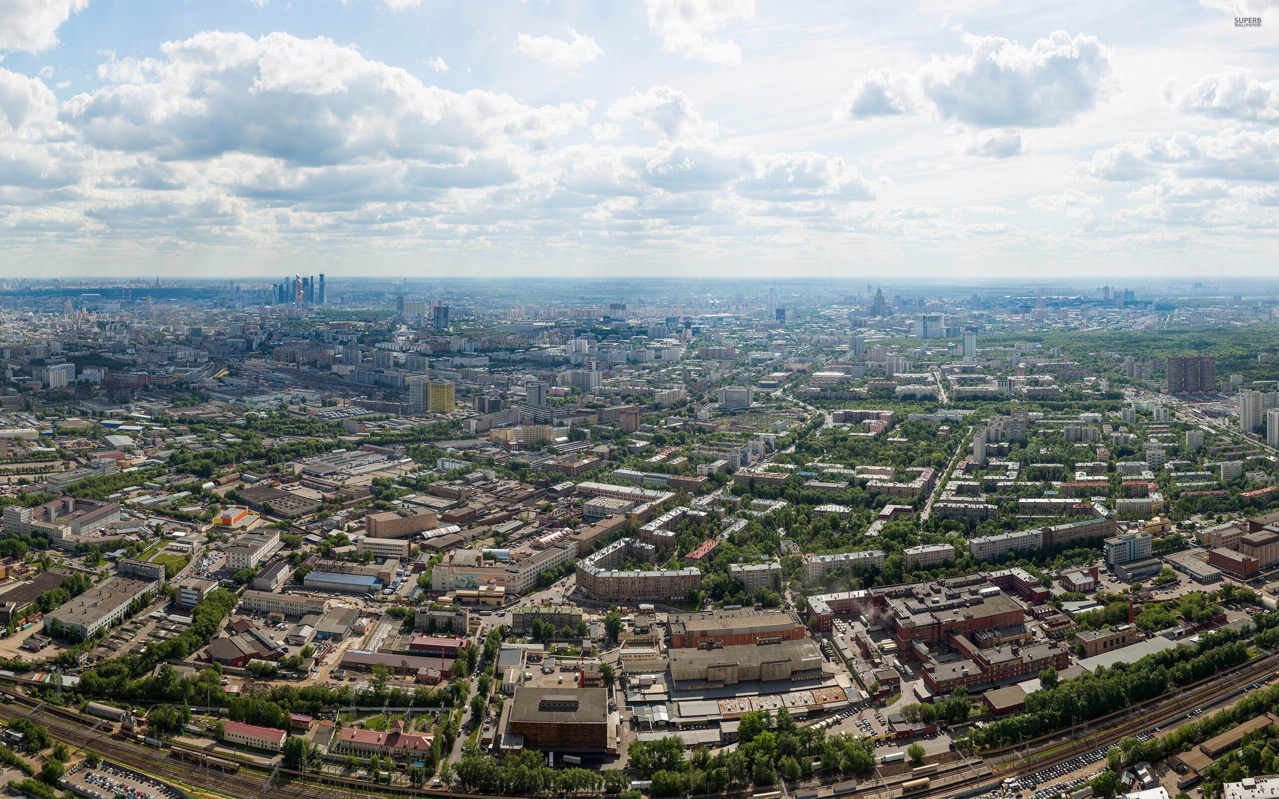 Description: A city with a lot of buildings and trees in the foreground and a cloudy sky above it.