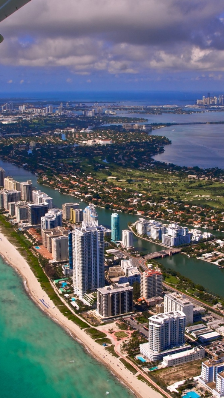 Description: A view of a city from an airplane window with a view of the ocean and a beach and a city.