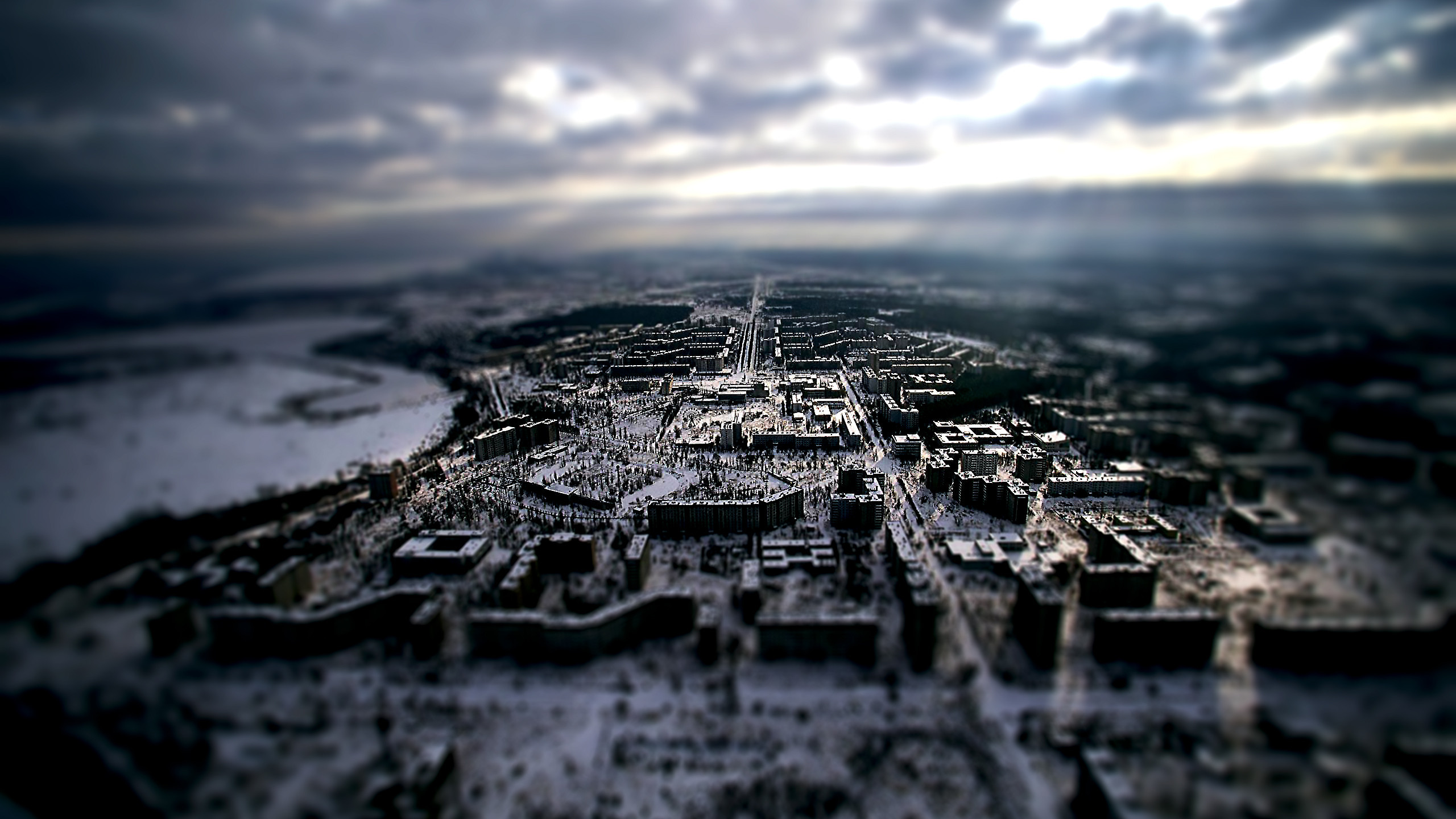 Description: A view of a city from a very high altitude plane window looking down on a city and a river.