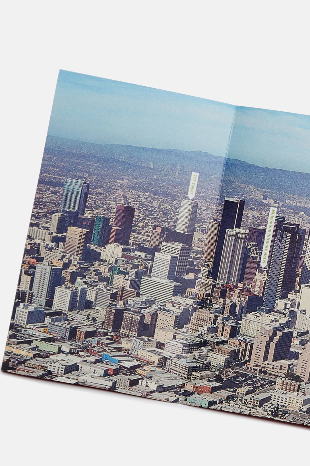 Description: A city view from a plane looking down on a city with tall buildings and a plane flying over it.