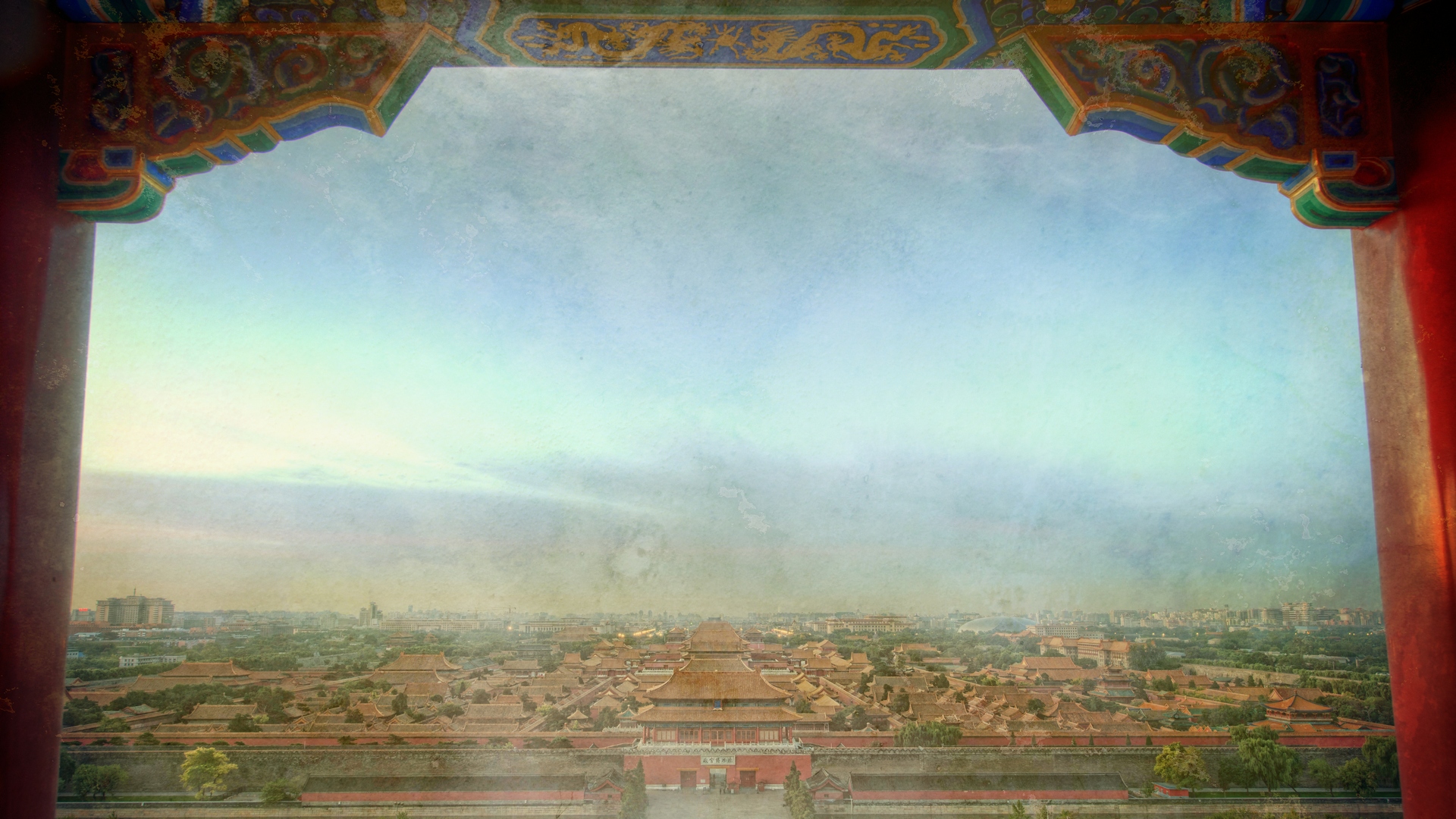 Description: A view of a city from a window with a red curtain and a blue sky in the background with a red frame.