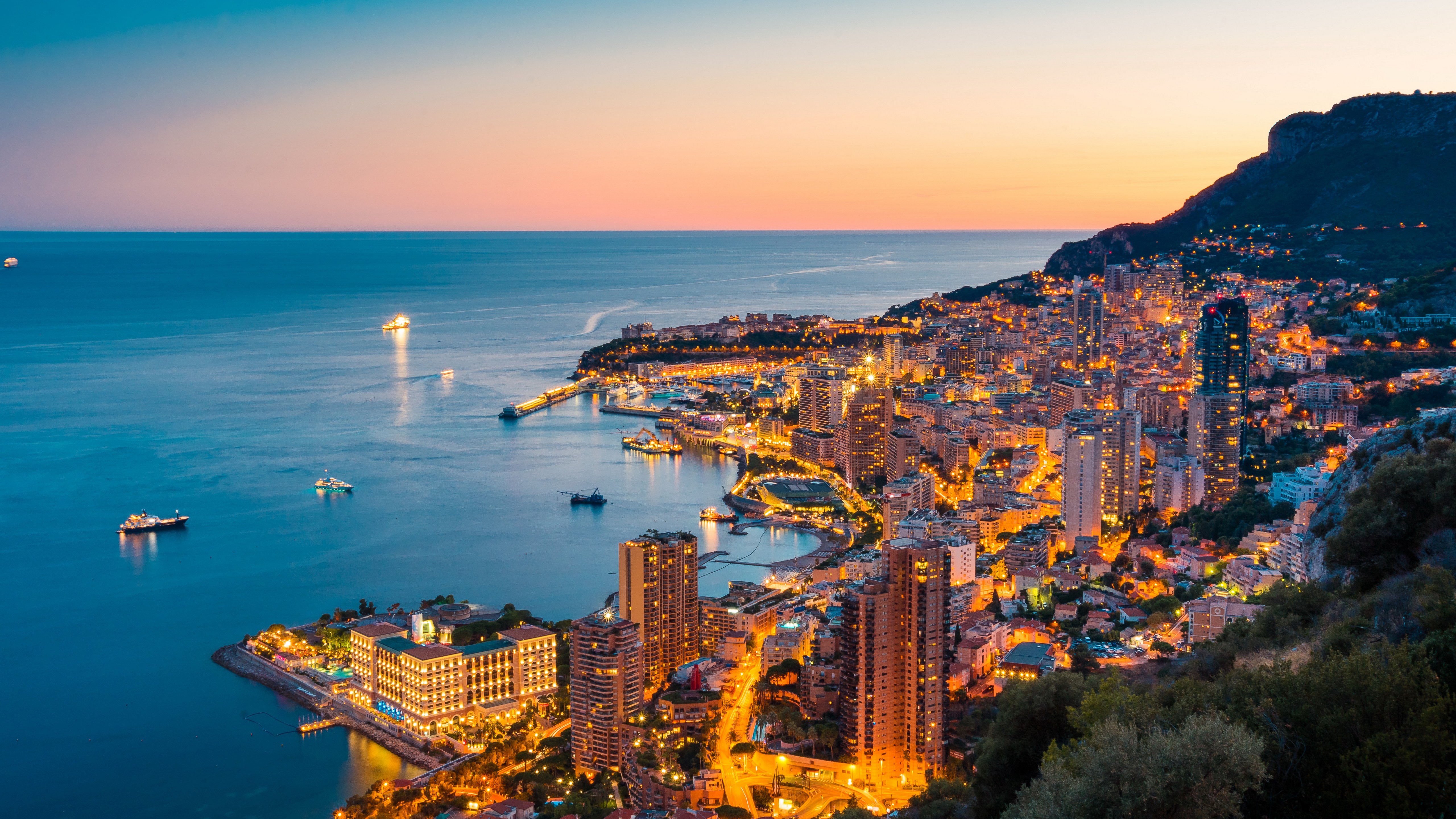 Description: A city by the water at night with a boat in the water and a mountain in the background with a boat in the water.
