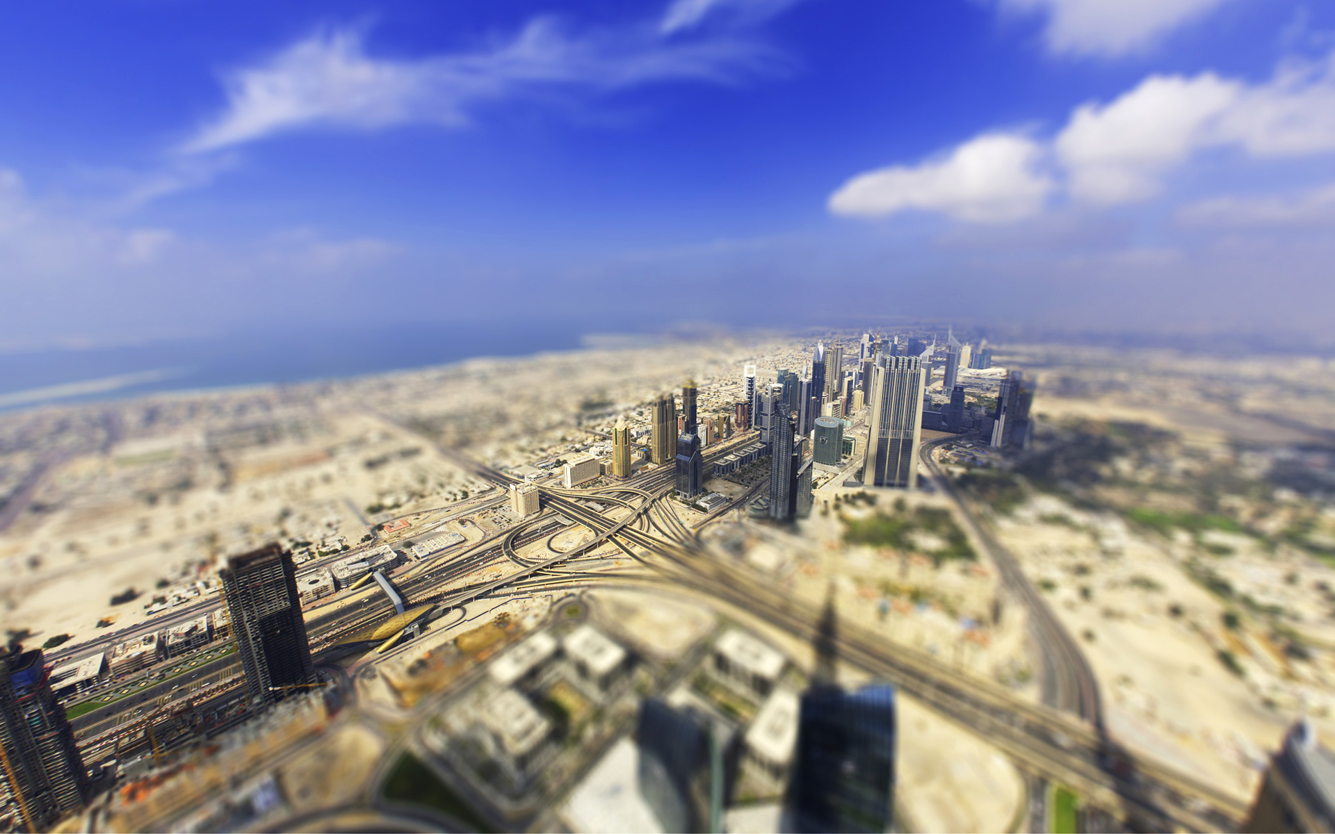 Description: A view of a city from a high up in the sky with a blue sky and clouds above it.
