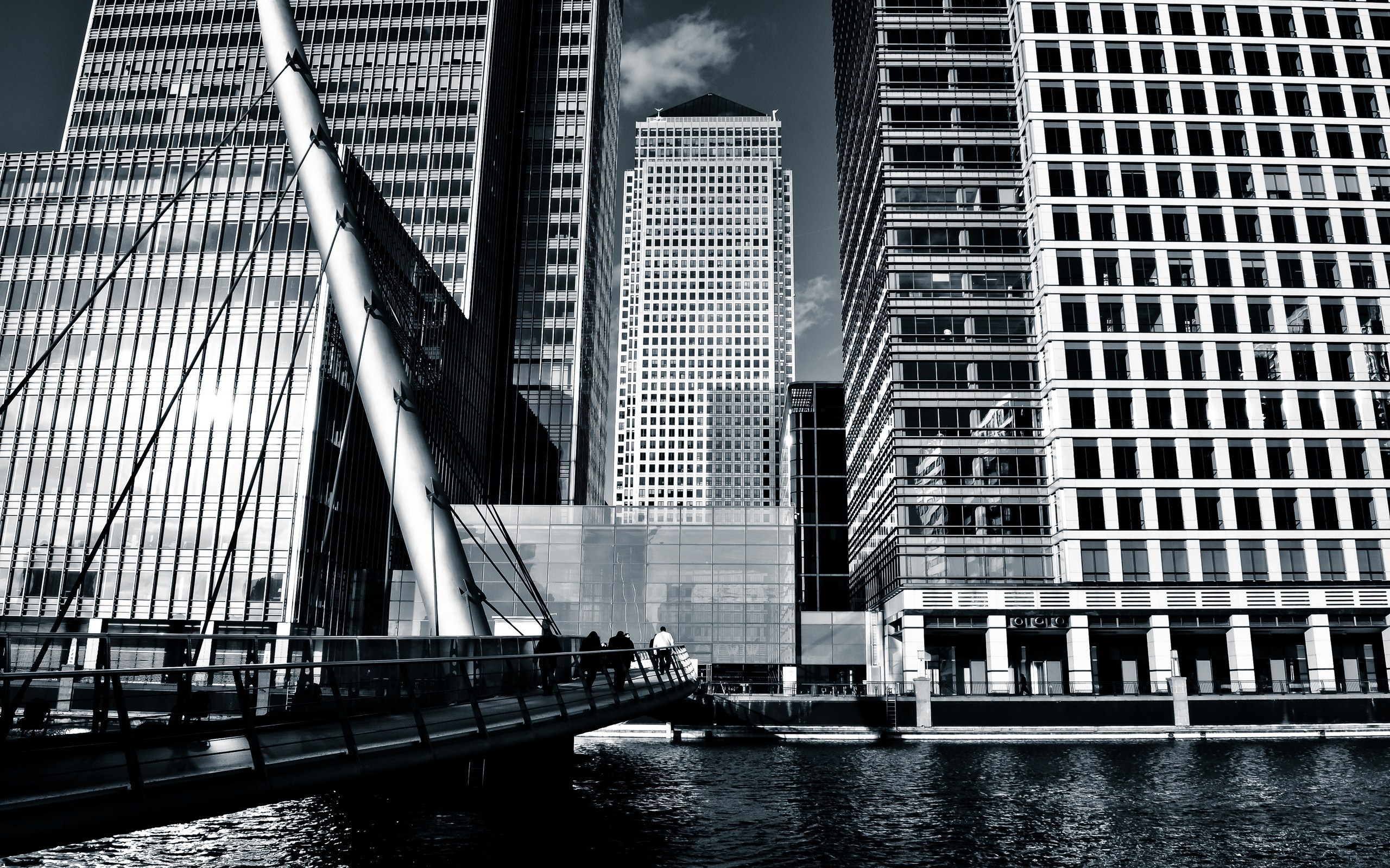 Description: A black and white photo of a bridge and buildings in a city with water and a bridge in front of it.