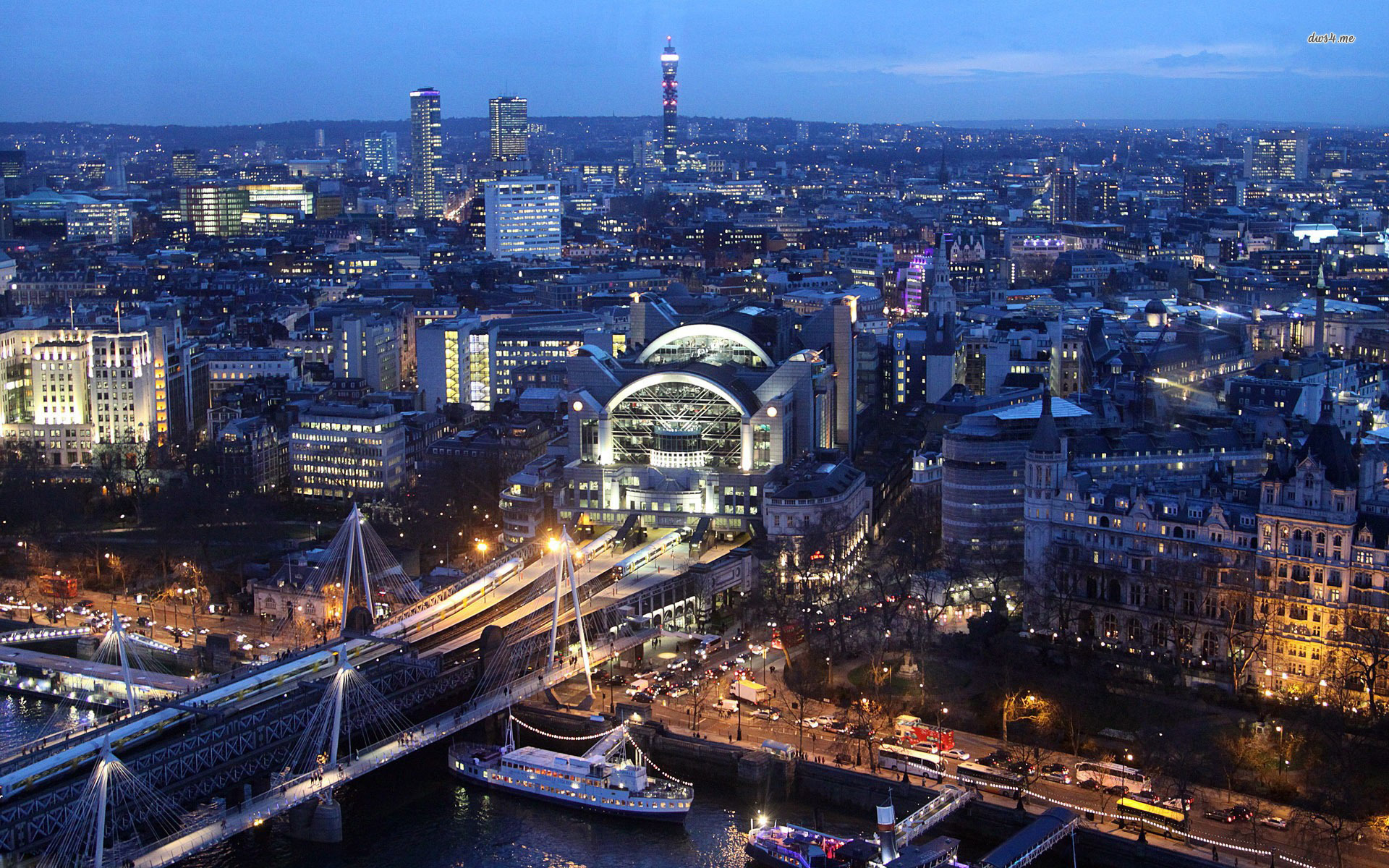 Description: A cityscape with a bridge and a river in the foreground and a city skyline in the background.