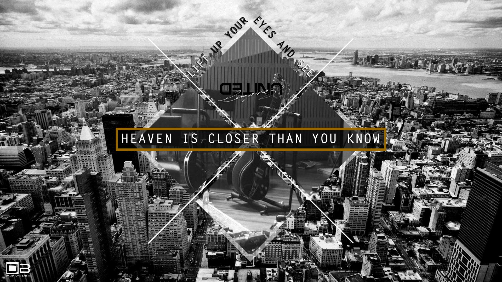 Description: A black and white photo of a city with a yellow border over it that says heaven is closer than you know.