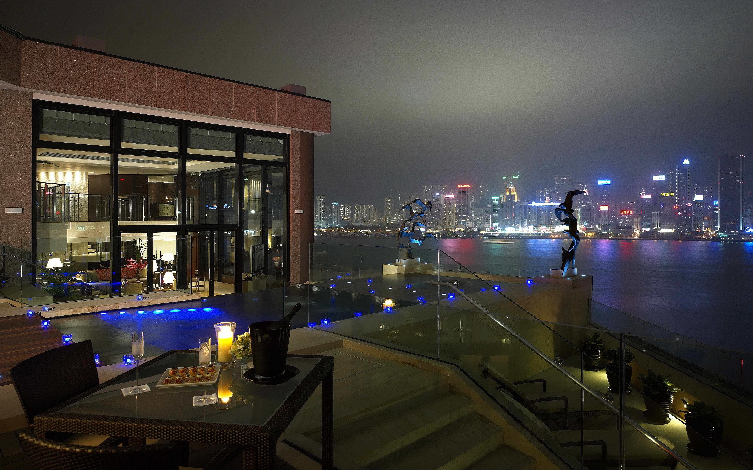 Description: A person on a glass railing overlooking a city at night with a view of the water and buildings in the distance.