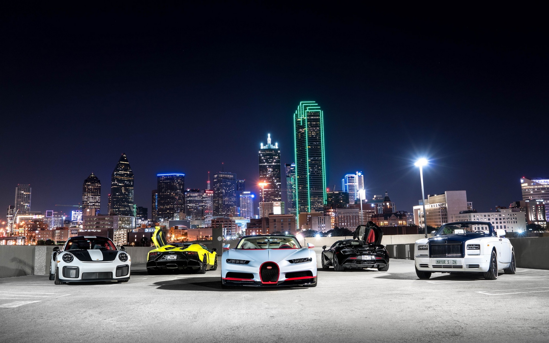 Description: A group of cars parked in a parking lot with a city skyline in the background at night time with lights on.