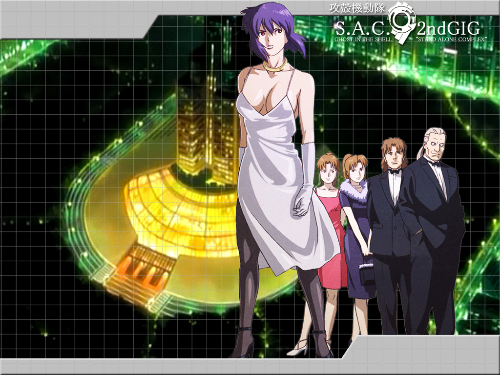 Description: A woman in a white dress standing in front of a group of people in a city at night with a neon background.