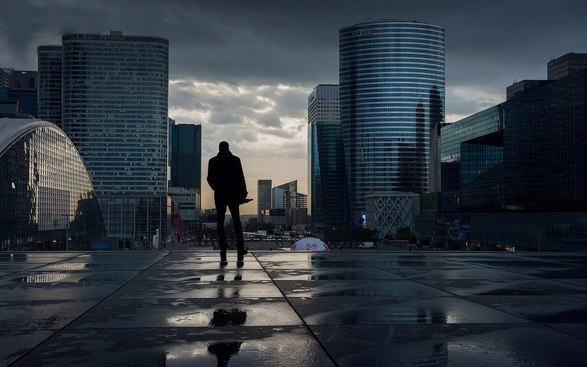 Description: A person standing on a wet sidewalk in front of tall buildings with a dark sky in the background and a few clouds in the sky.