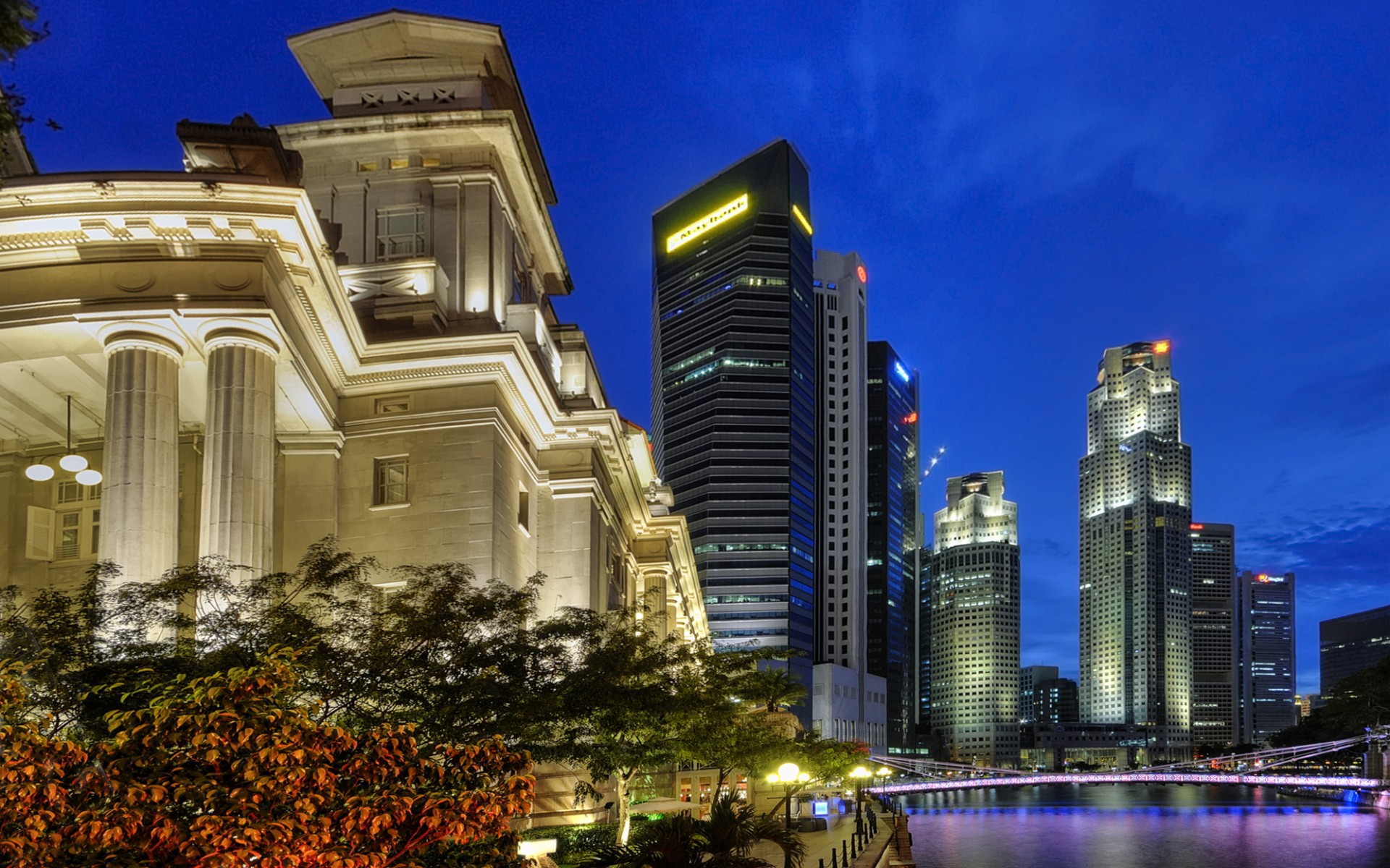 Description: A city at night with a bridge and buildings in the background and a river running through it with lights on.