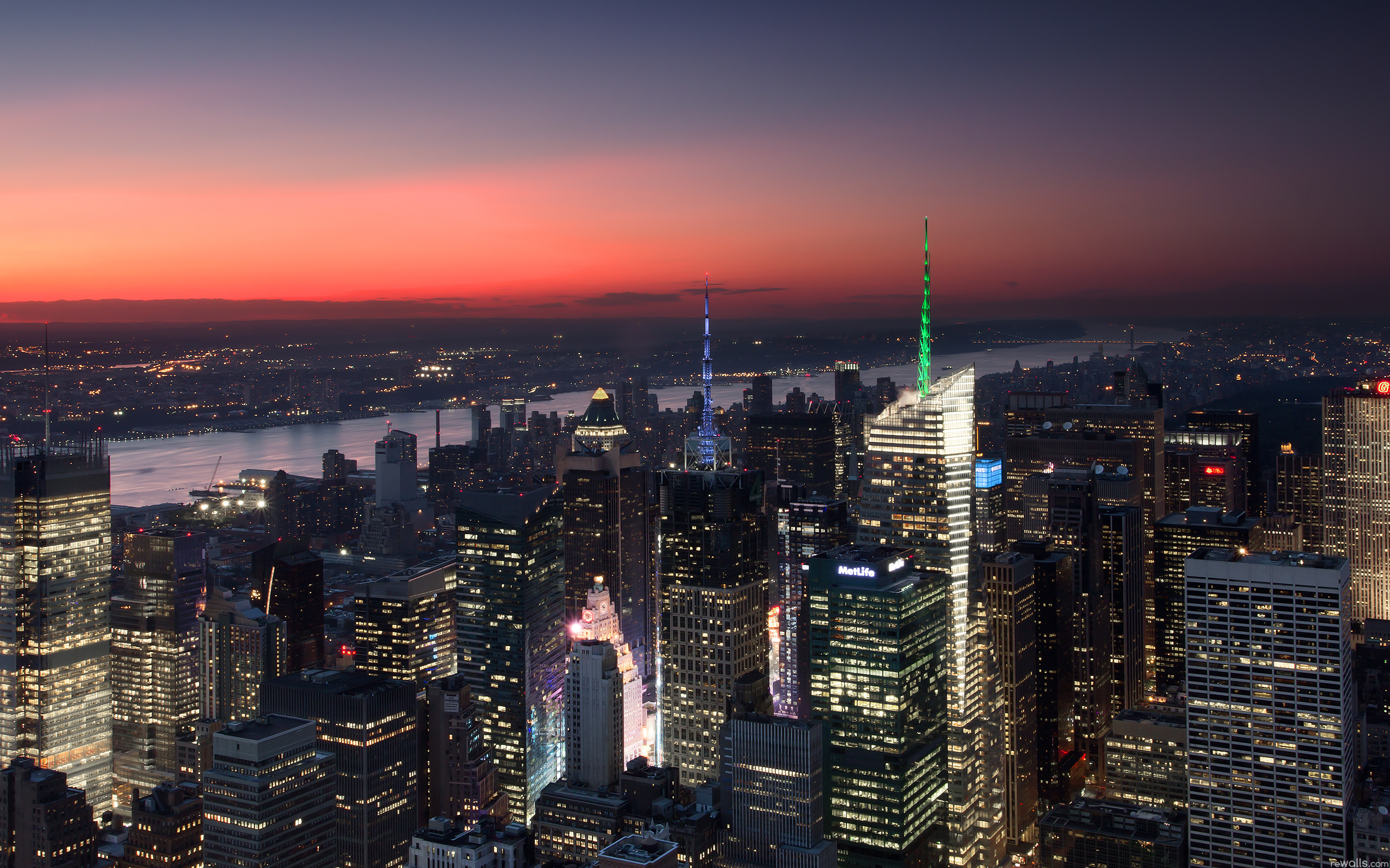 Description: A city skyline at night with a bright red sky and a river in the background with a bright green spire.