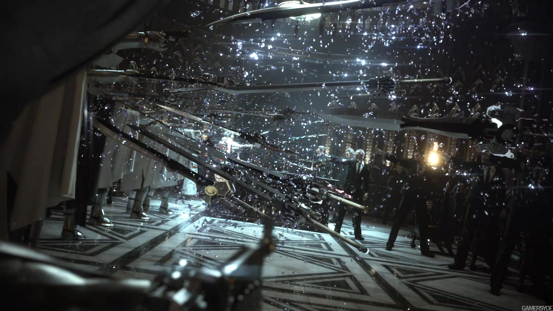 Description: A group of people standing around a room filled with lights and rain drops on the floor and ceiling of a building.