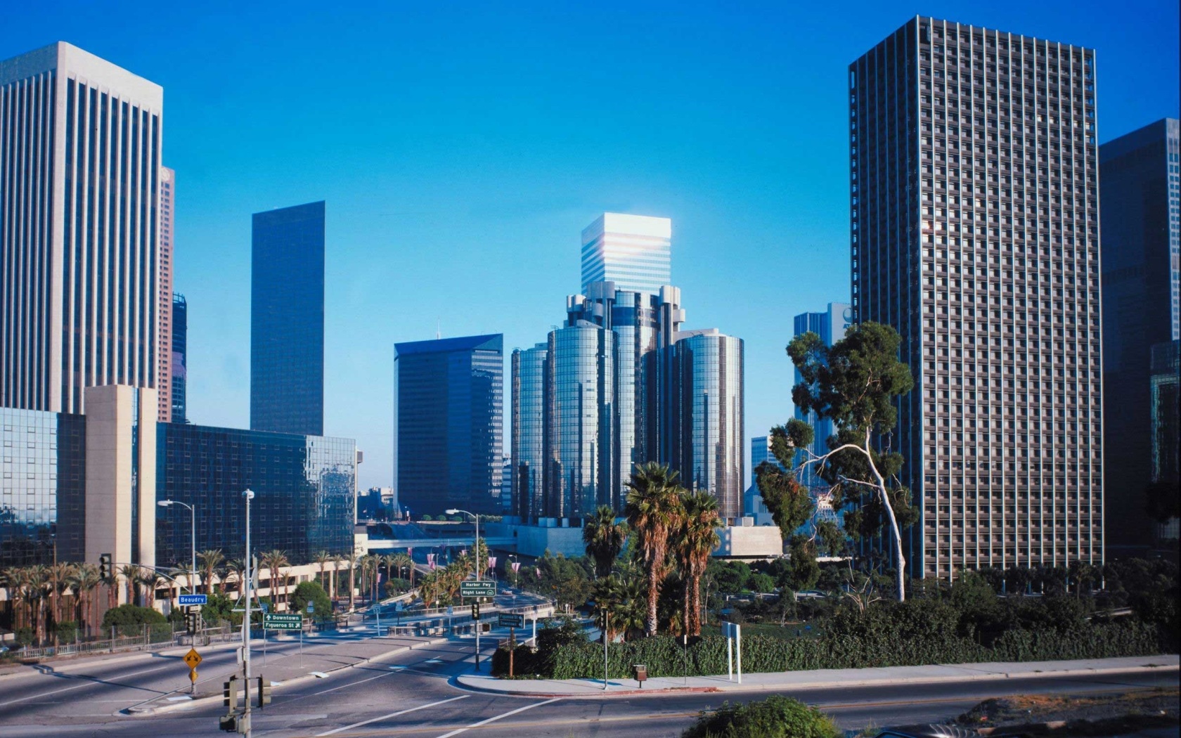 Description: A city street with tall buildings and palm trees in the foreground and a blue sky in the background.