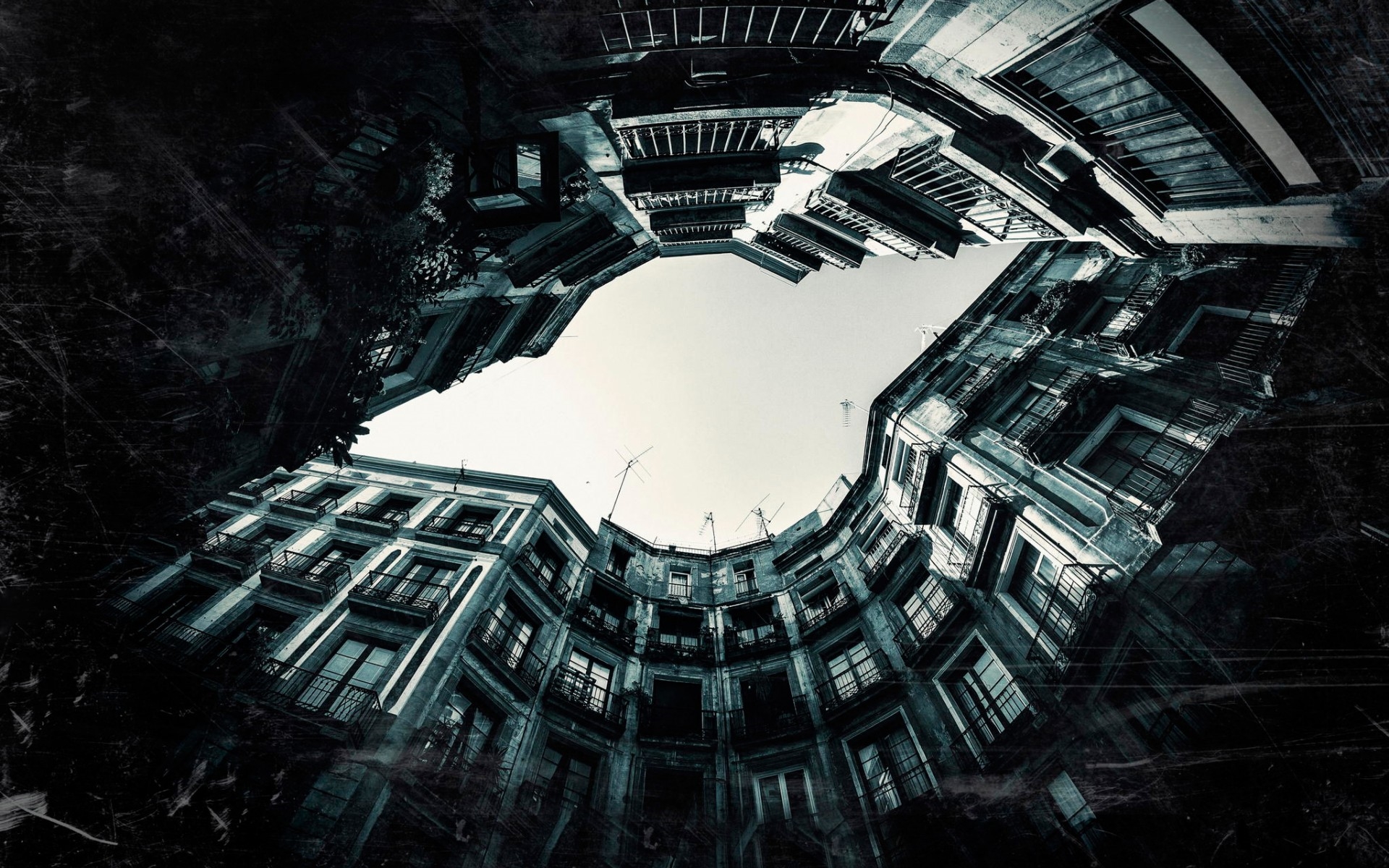 Description: A view of a building from the ground looking up at the sky and buildings in the background with a circular window.