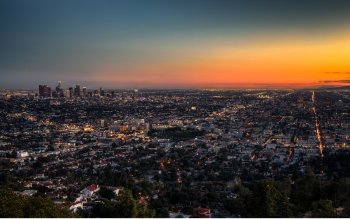 Description: A cityscape with a sunset in the background and a city in the foreground with a sky line.