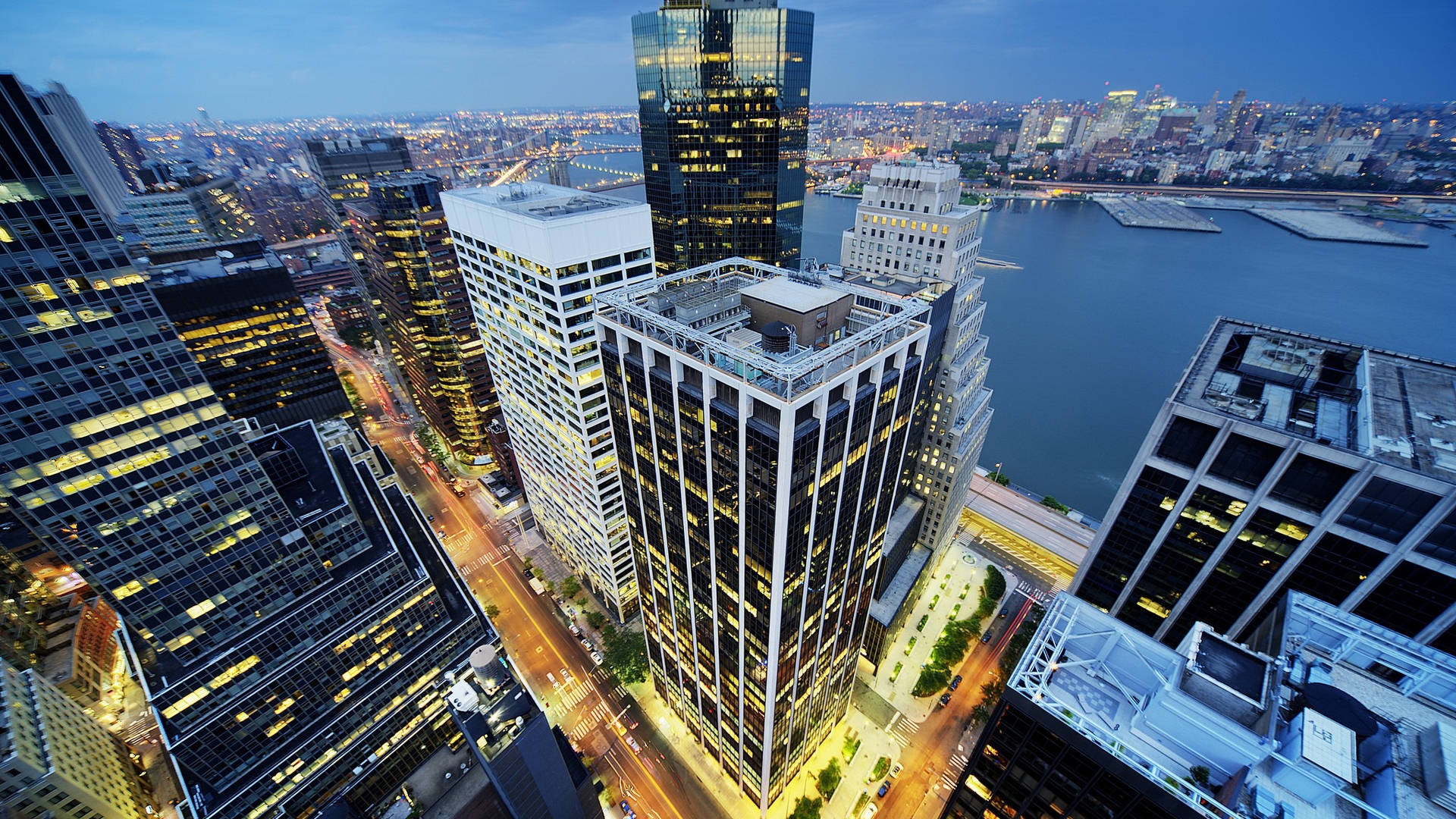 Description: A cityscape with a lot of tall buildings and a river in the background at night time with lights on.