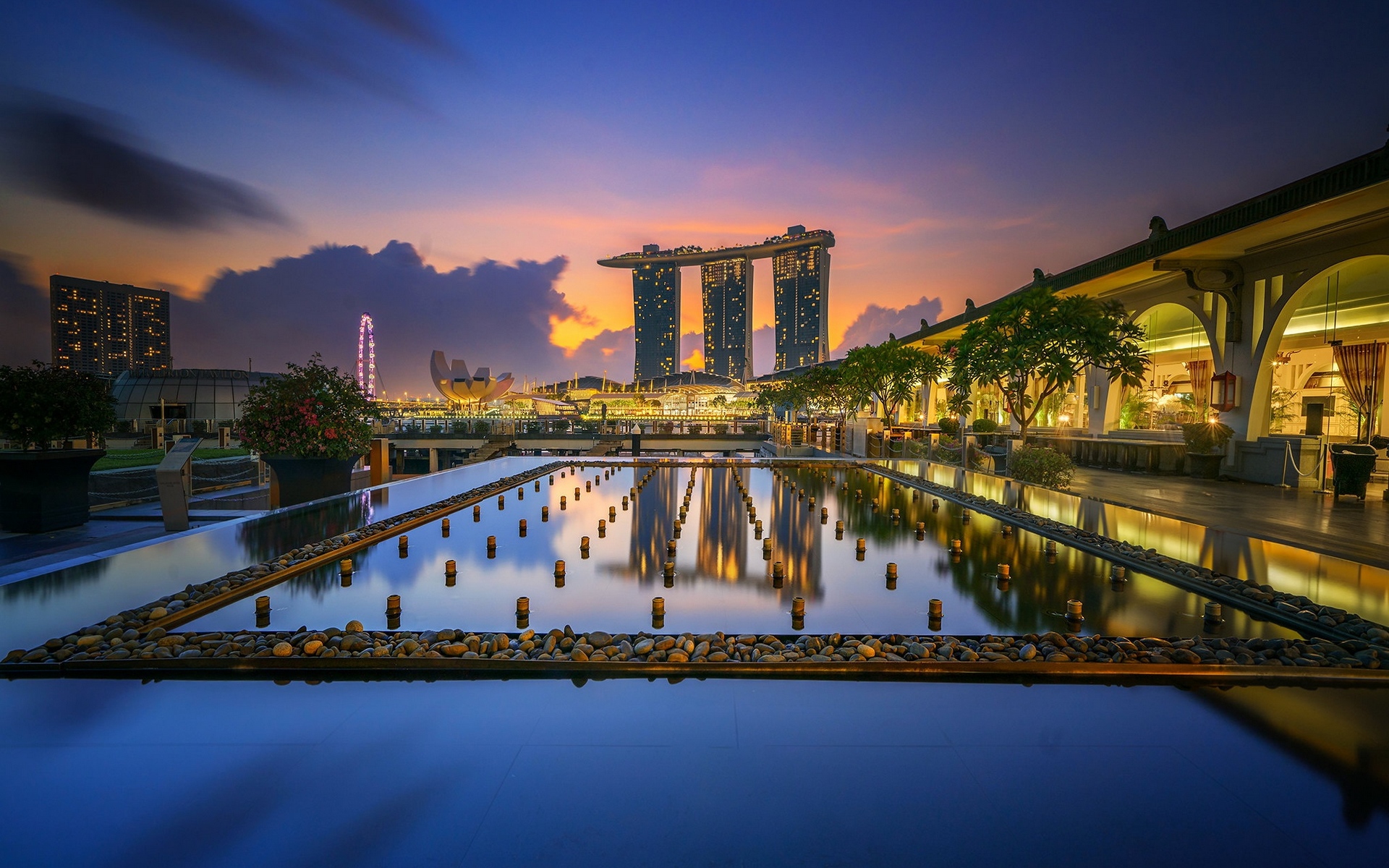 Description: A large pool with a view of a city at night time with buildings in the background and a few clouds.