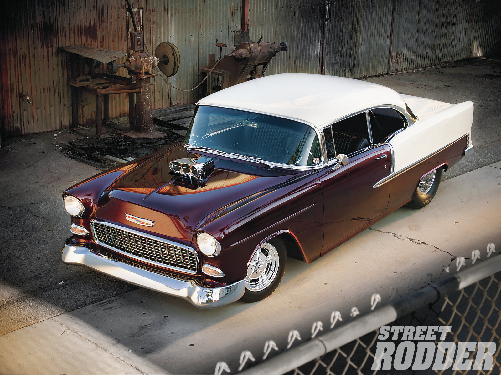 Description: A classic car parked in a garage with a hood up on it's hood and hood up on the hood.