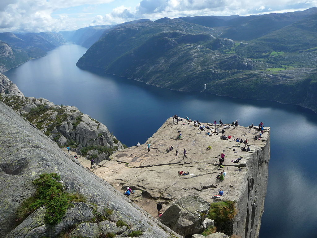 Description: A group of people standing on top of a cliff next to a lake and mountains in the background with a sky background.