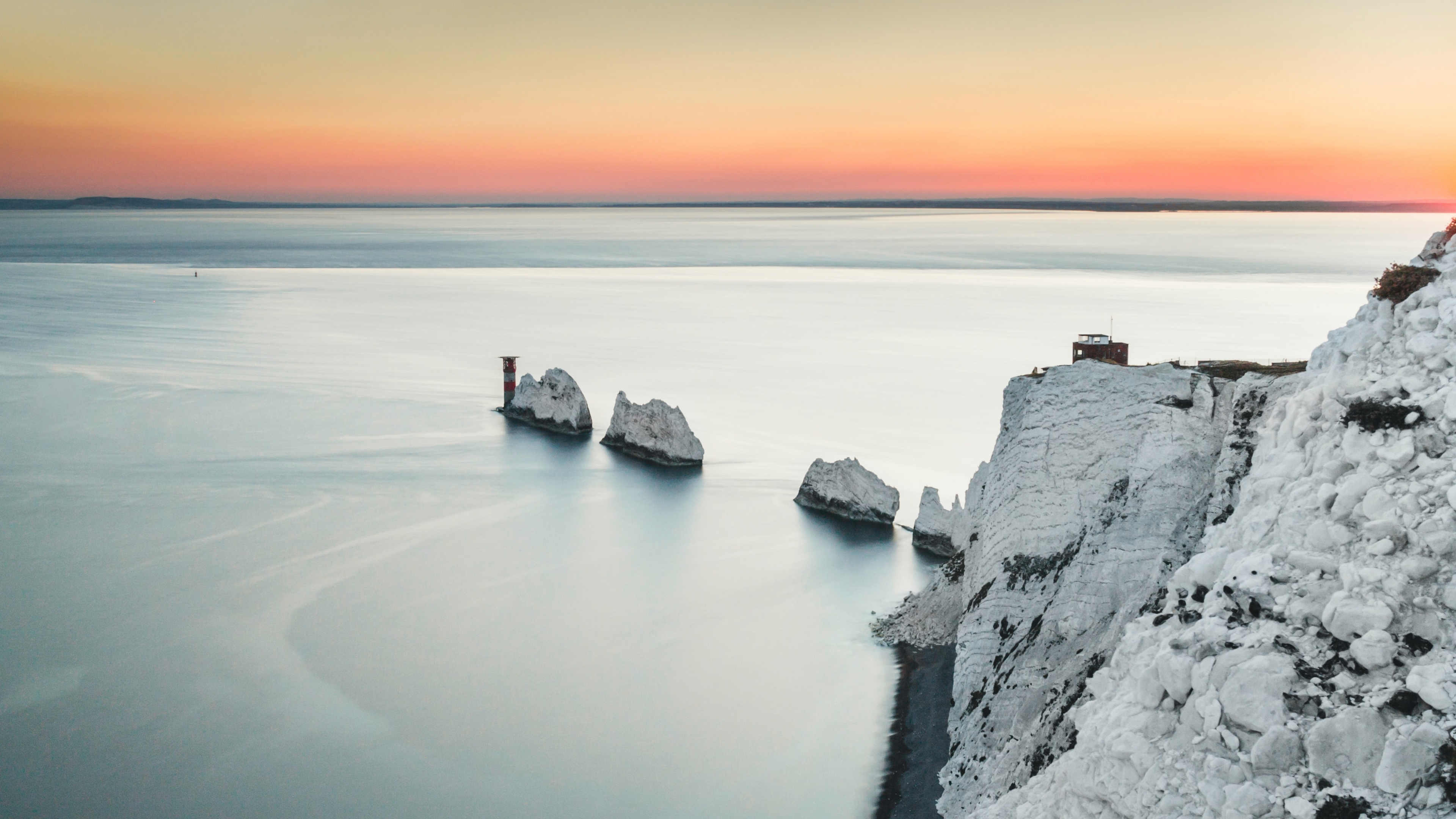 Description: A view of a body of water with a cliff in the middle of it and a lighthouse on the other side.