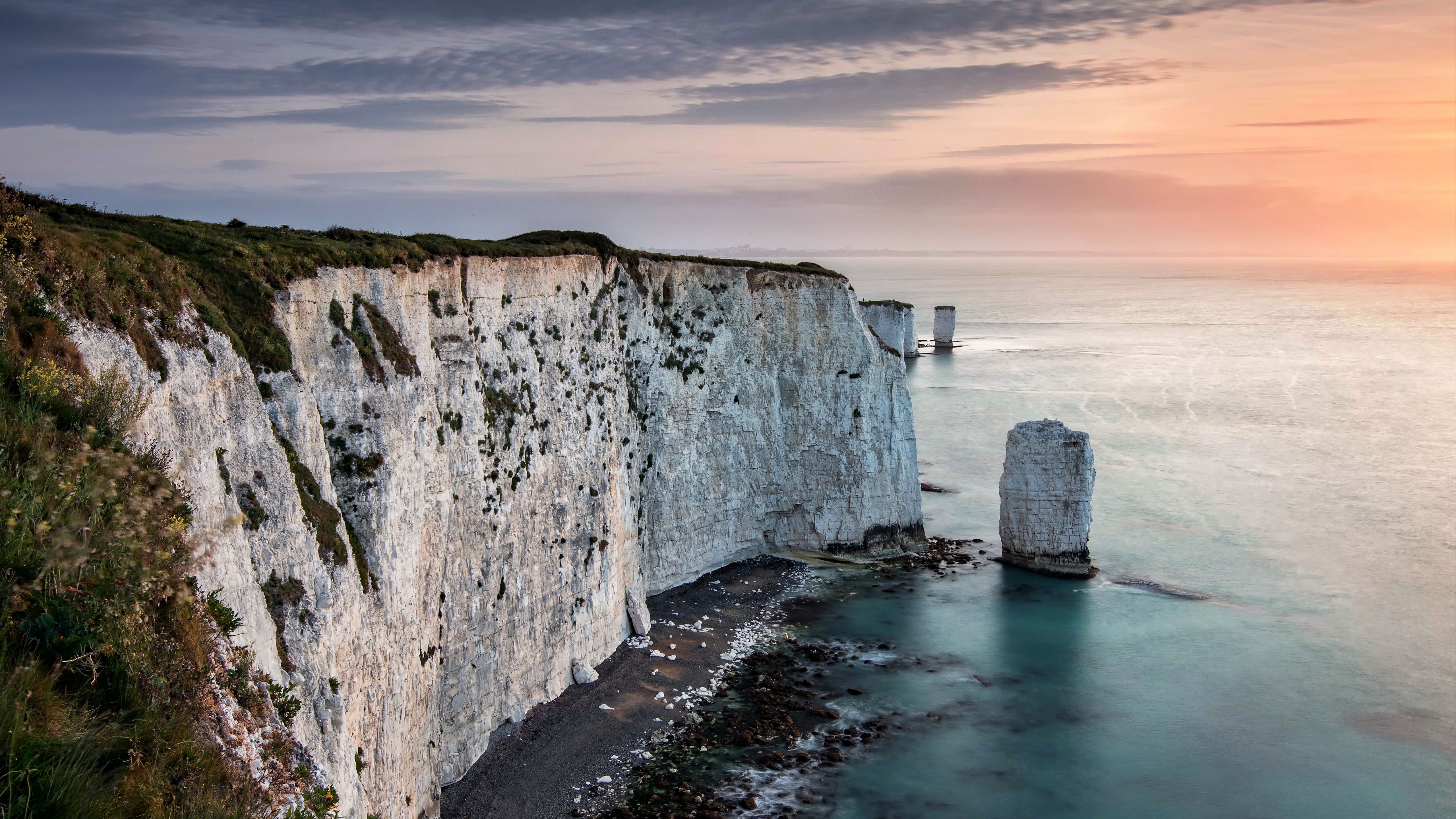 Description: A cliff with a large body of water next to it and a lighthouse on top of it at sunset.