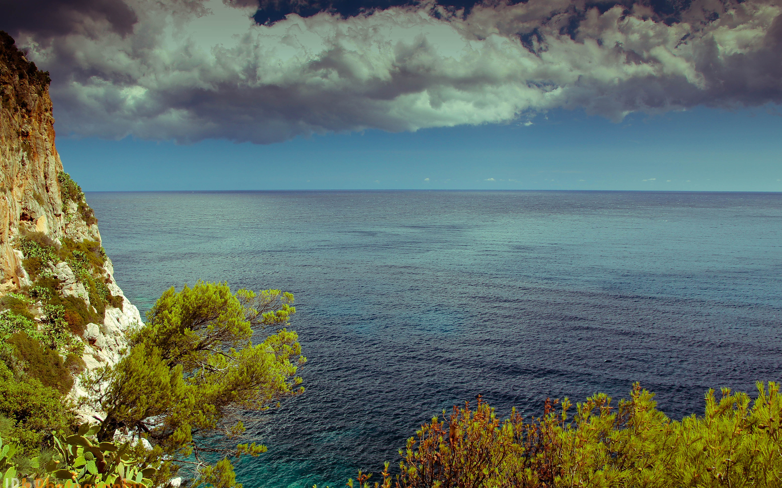 Description: A cliff overlooking the ocean under a cloudy sky with a few clouds above it and a few trees below.