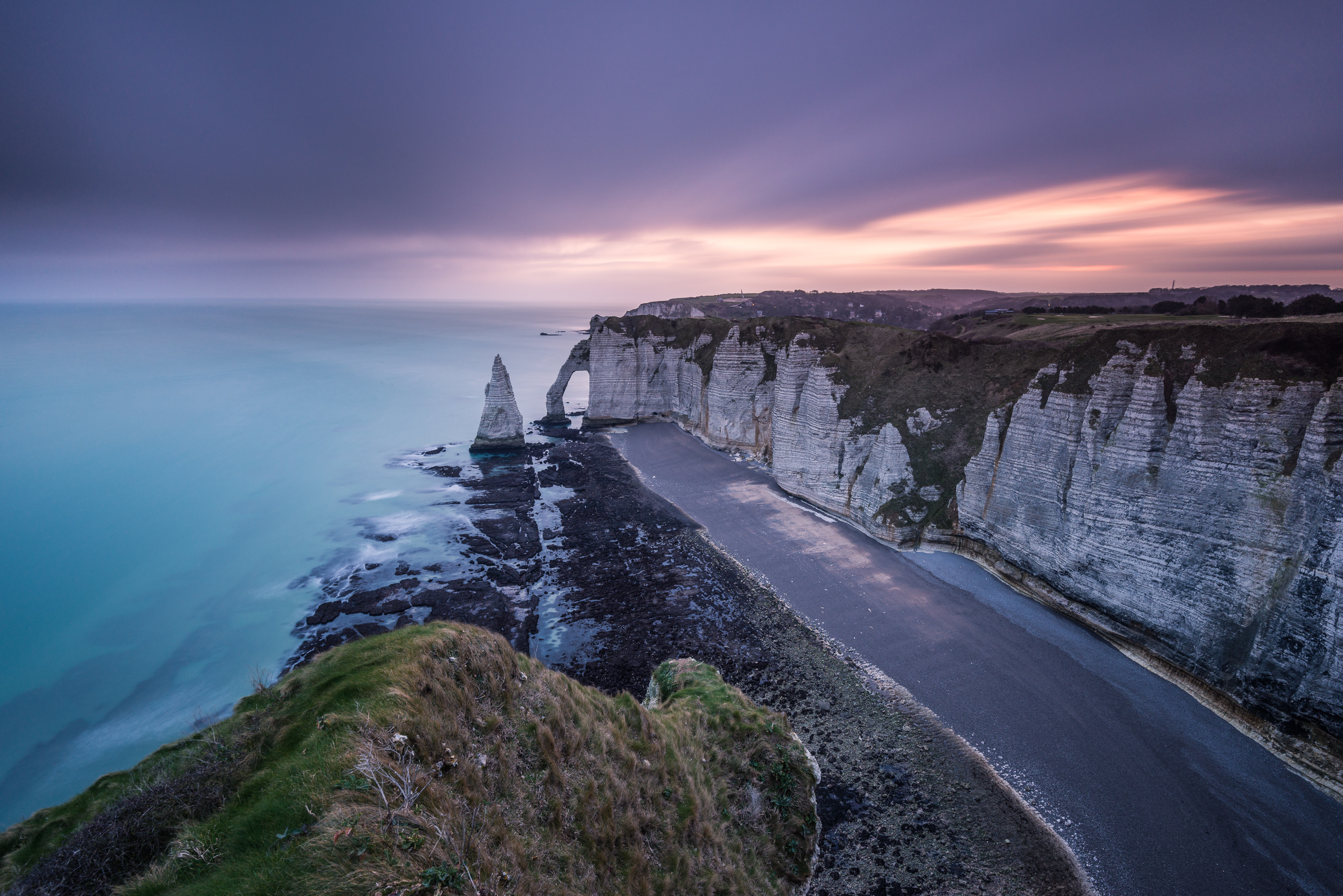 Description: A road going down a cliff next to the ocean with a cliff in the background and a cliff in the foreground.