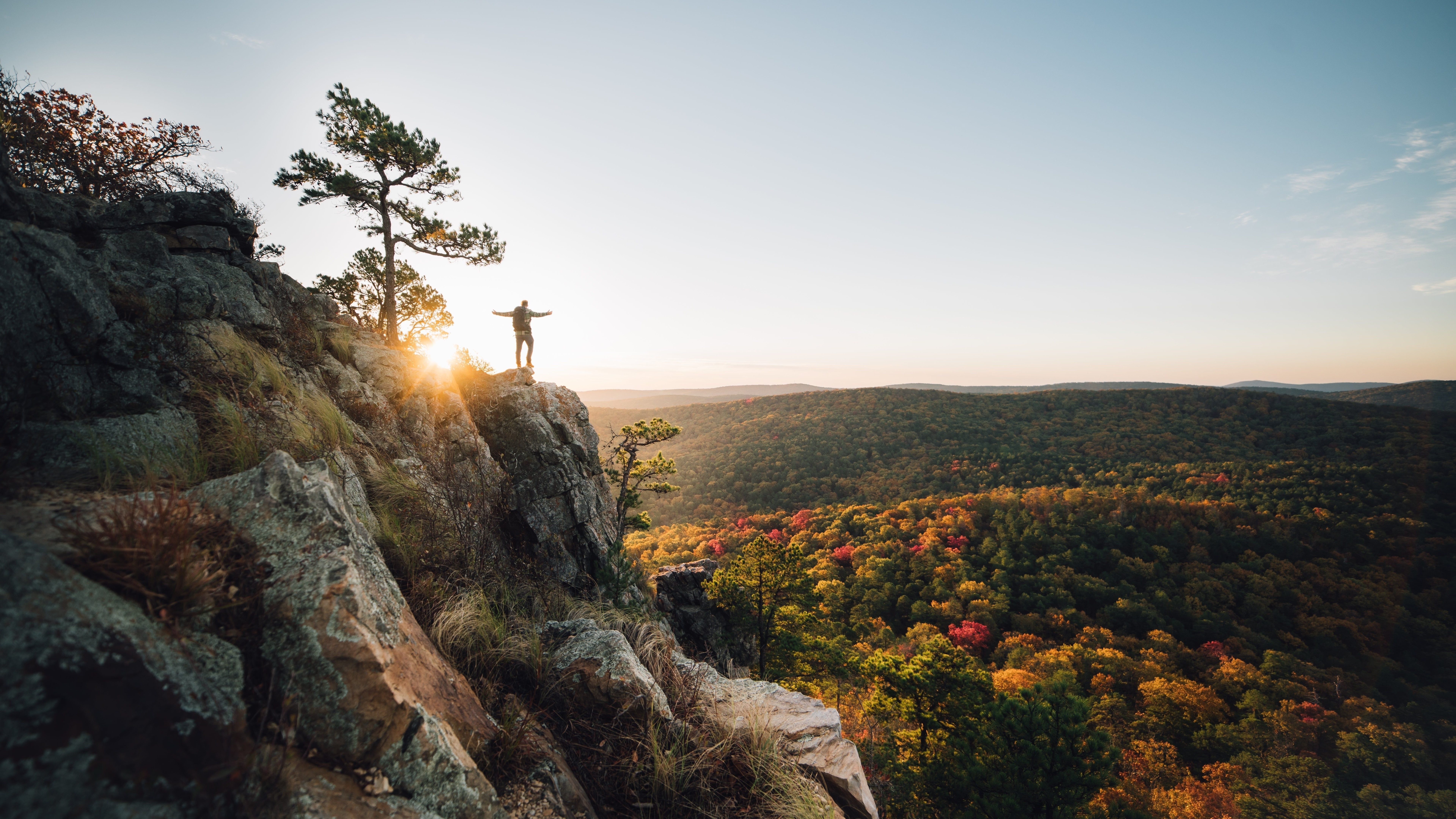 Description: A person standing on a cliff with a tree on top of it with a sunset in the background and a mountain with trees.