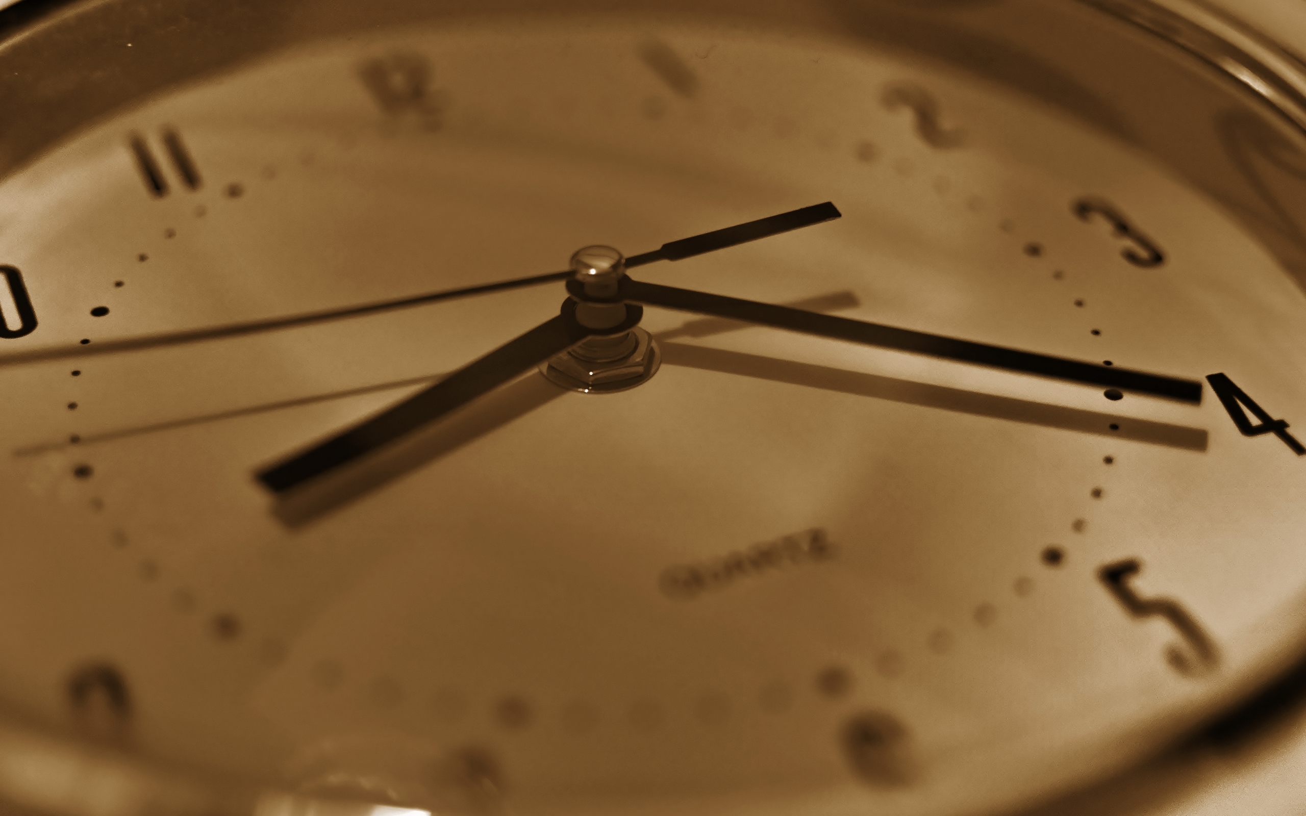 Description: A close up of a clock with a brown background and black hands and numbers on the face of the clock.
