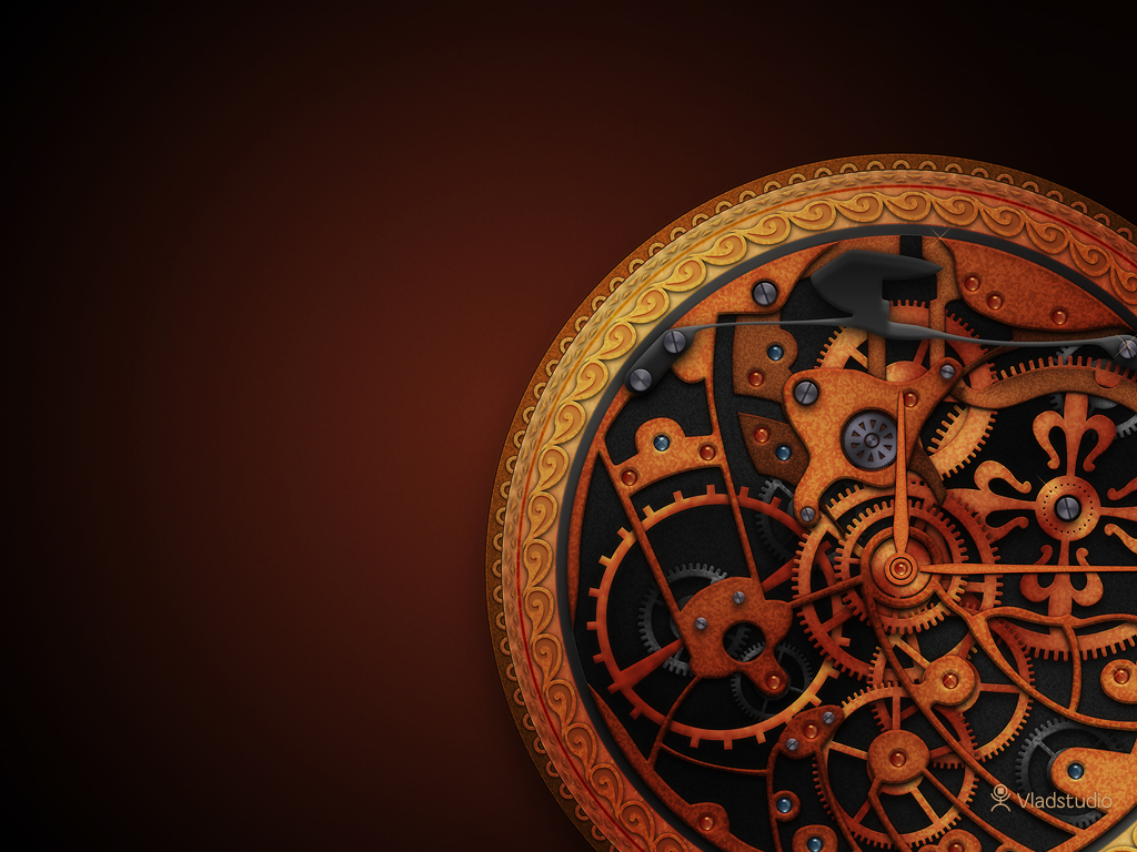 Description: A clock with gears and chains on it's face and a red background with a black background behind it.