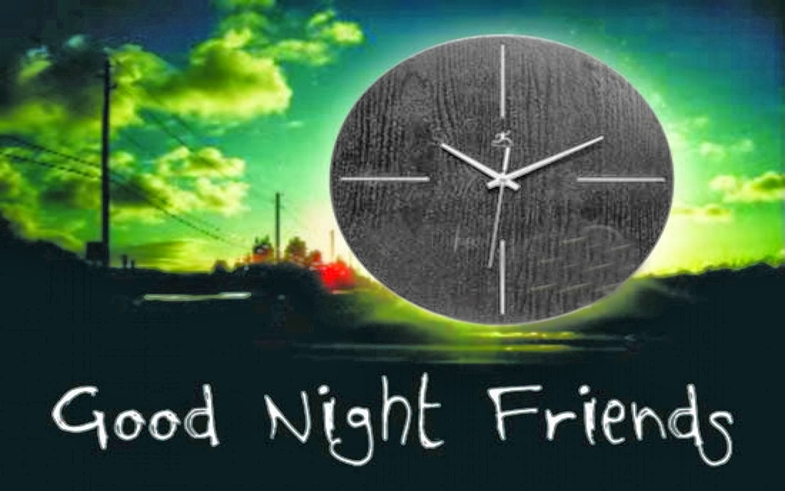Description: A clock with the words good night friends written on it and a picture of a factory in the background.