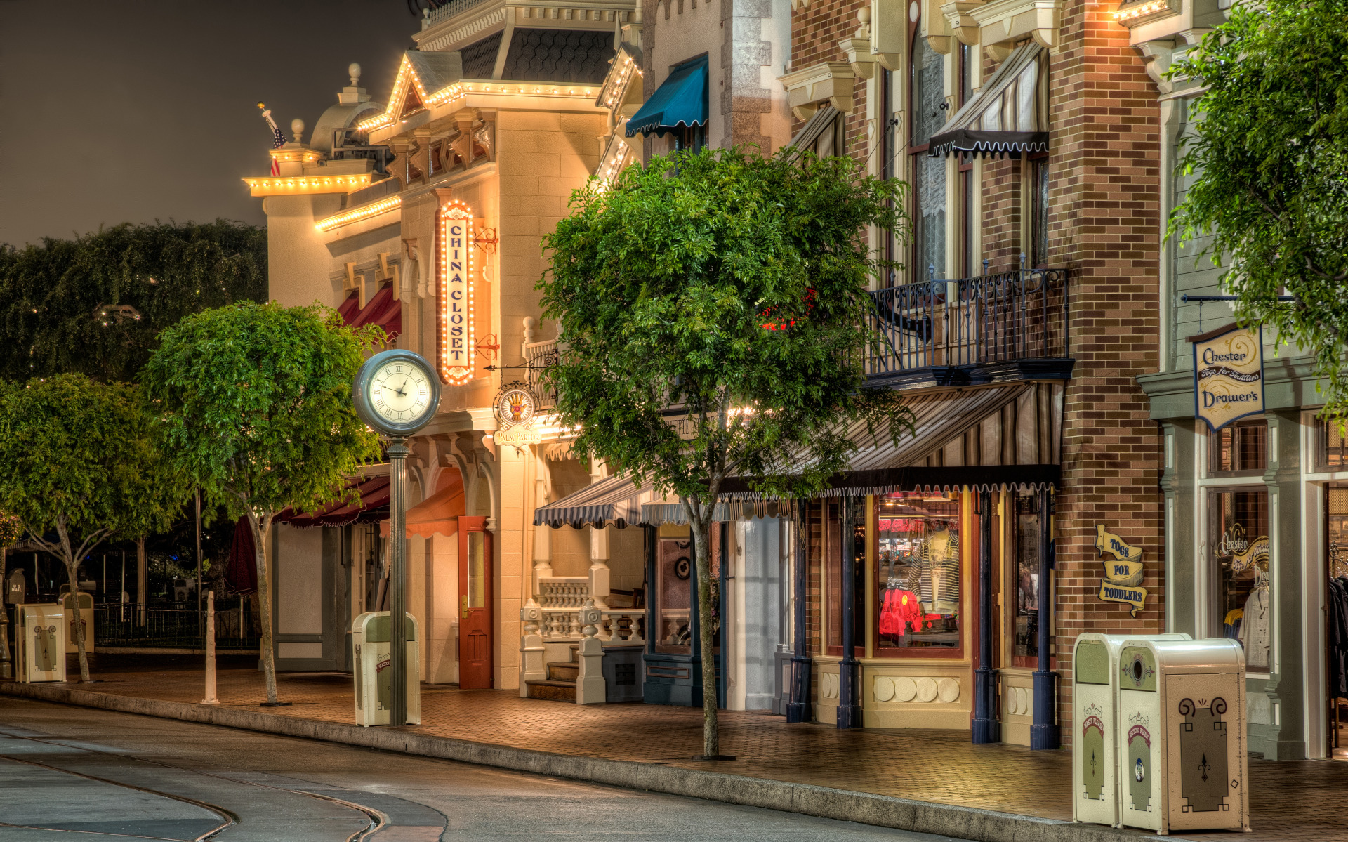Description: A clock on a pole on a city street at night time with a building in the background and trees in the foreground.