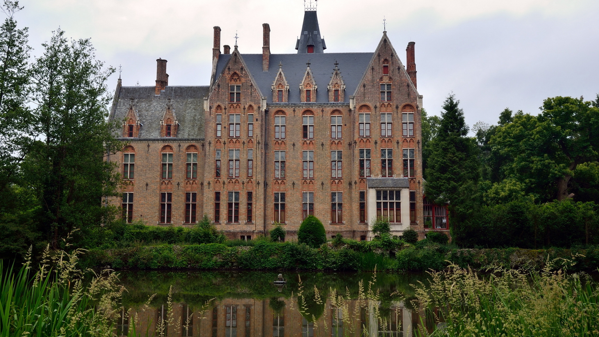 Description: A large building with a tower and a clock on top of it next to a body of water with trees and bushes.