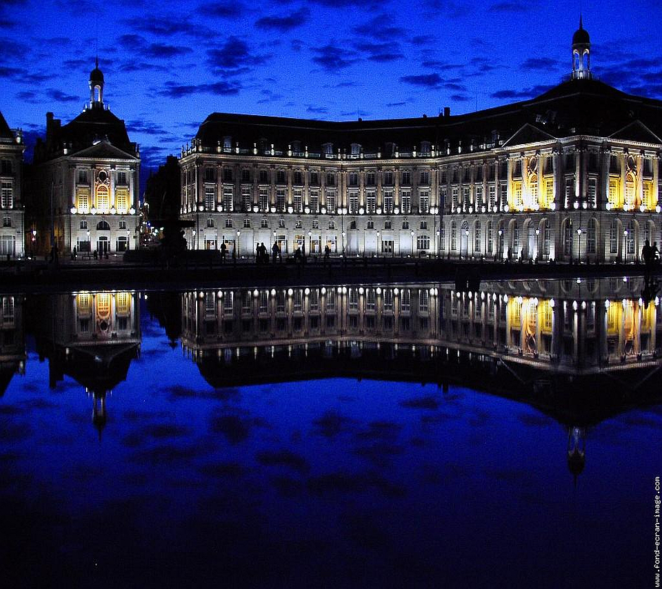 Description: A building with a clock tower and a reflection in the water at night time with a blue sky and clouds.