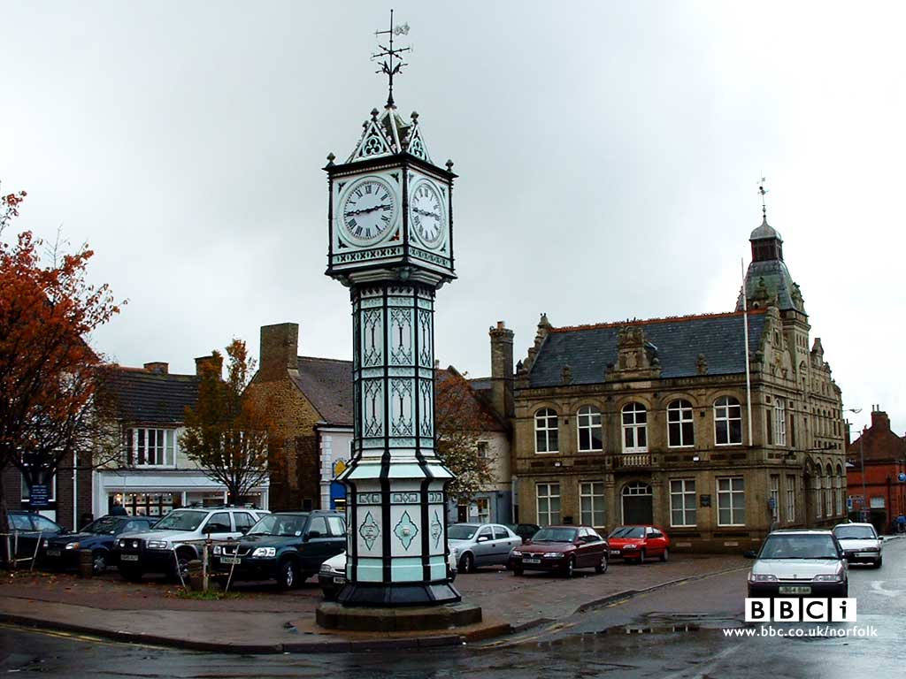 Description: A clock tower in a town square with cars parked in the street behind it and a building in the background.