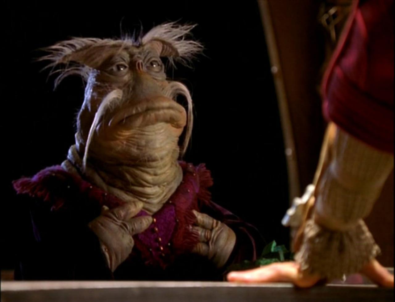Description: A close up of a person wearing a costume and a foot in the air with a puppet on the ground.