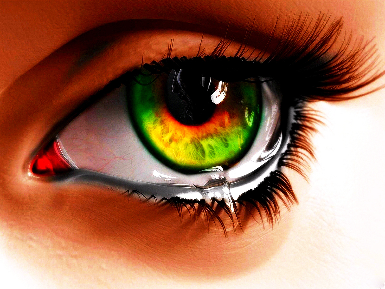 Description: A close up of a person's eye with a pair of scissors in it's iris and a red and yellow eye shadow.