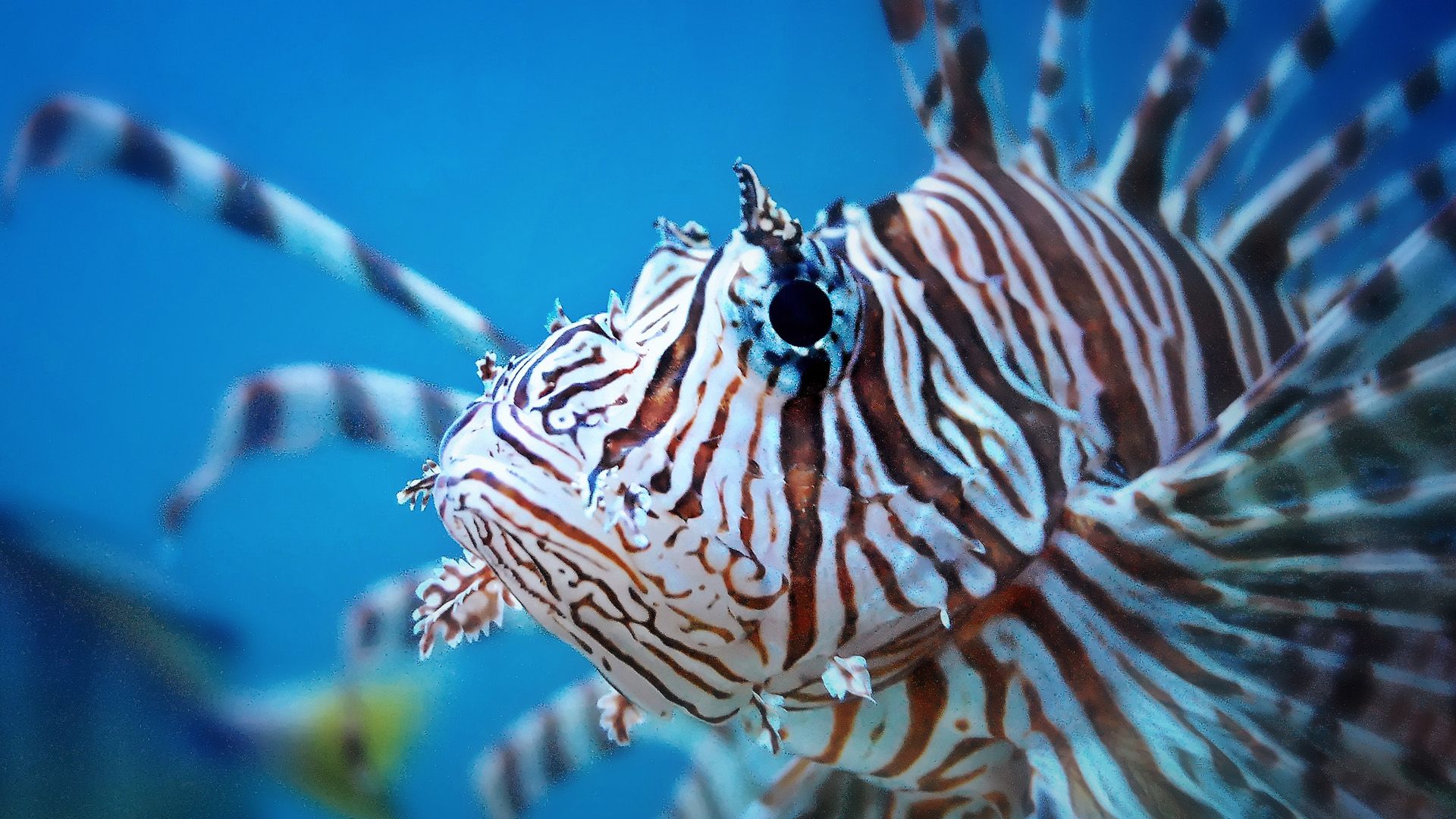 Description: A close up of a fish with a blue background and a blurry background behind it.