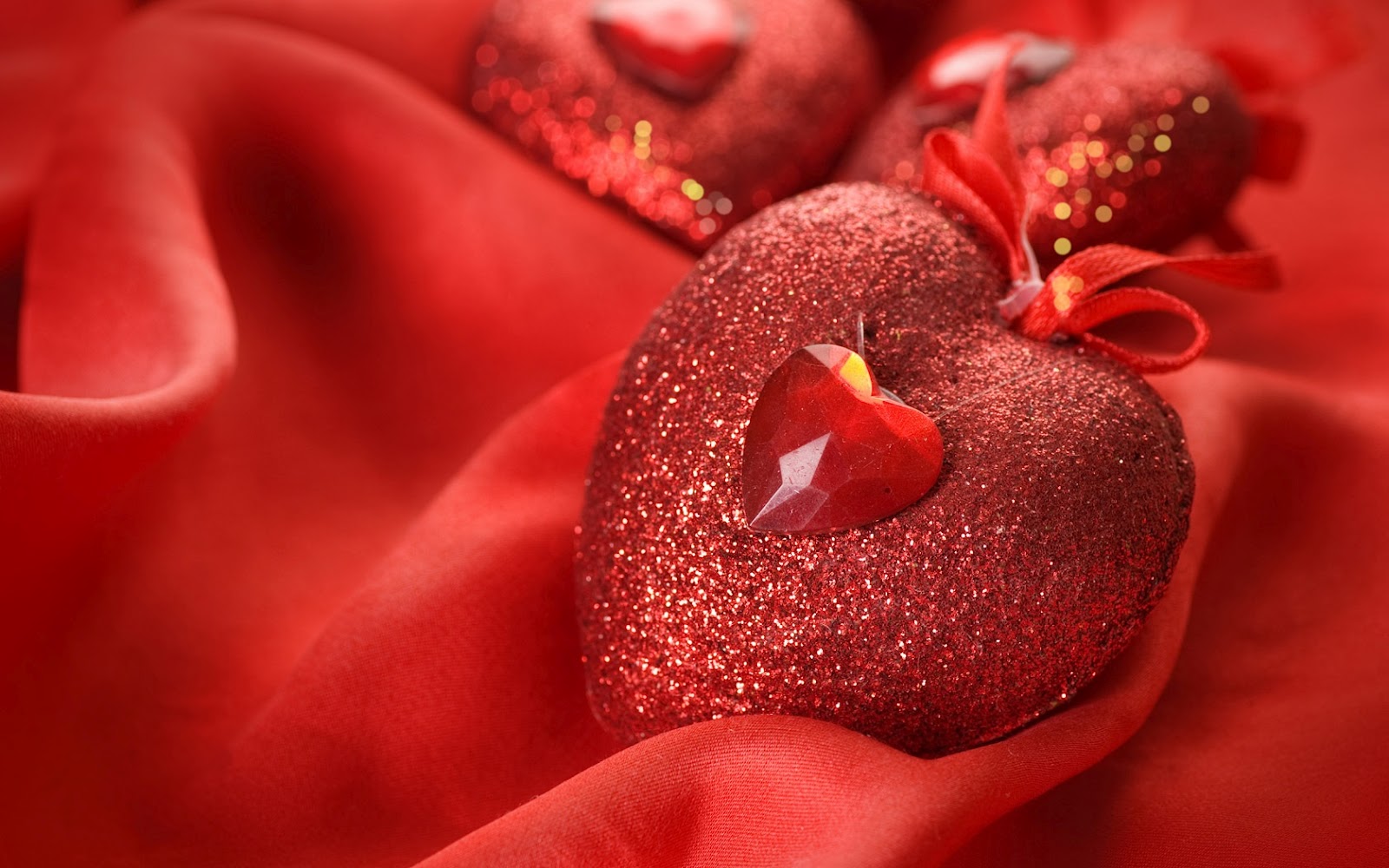 Description: A close up of two red hearts on a red cloth with a red bow on it's end.