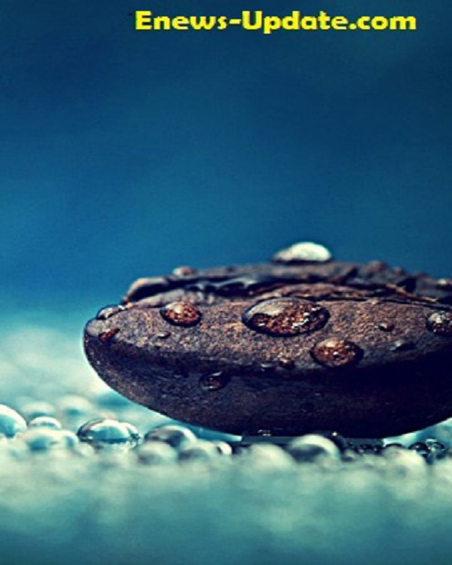 Description: A close up of a rock with water droplets on it and a caption that reads.