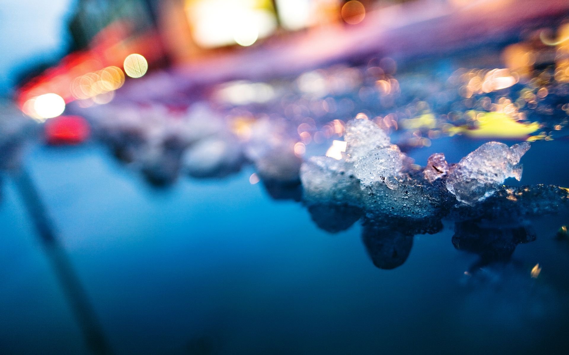 Description: A close up of a street with cars and buildings in the background and ice on the ground and a blurry image of a car.