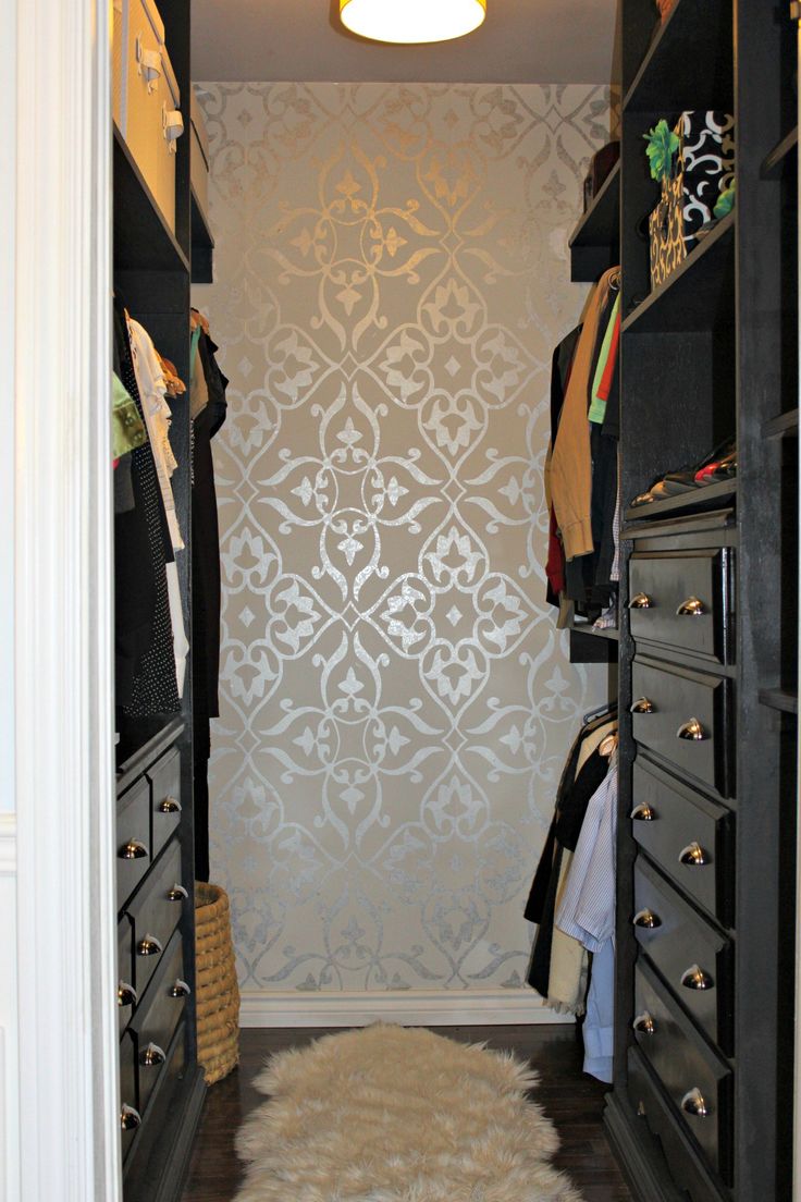 Description: A closet with a rug and a coat rack with clothes on it and a light hanging above it and a wall with a pattern.
