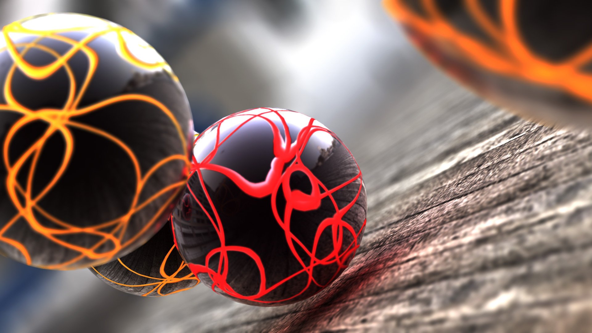 Description: A close up of two balls on a wooden surface with a blurry background of orange and black circles.