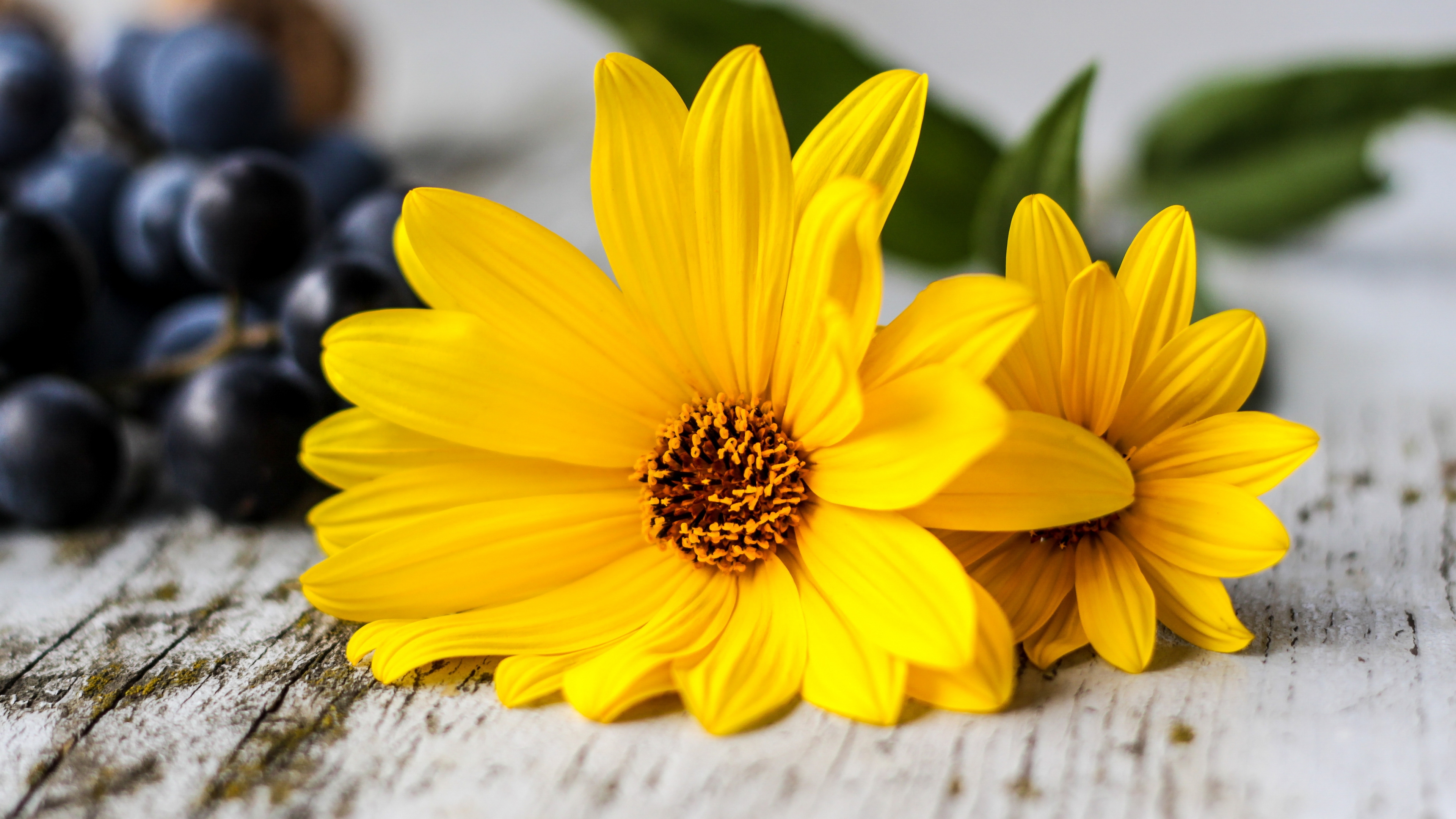 Description: A close up of two flowers on a table with grapes and leaves in the background and a blue berry.